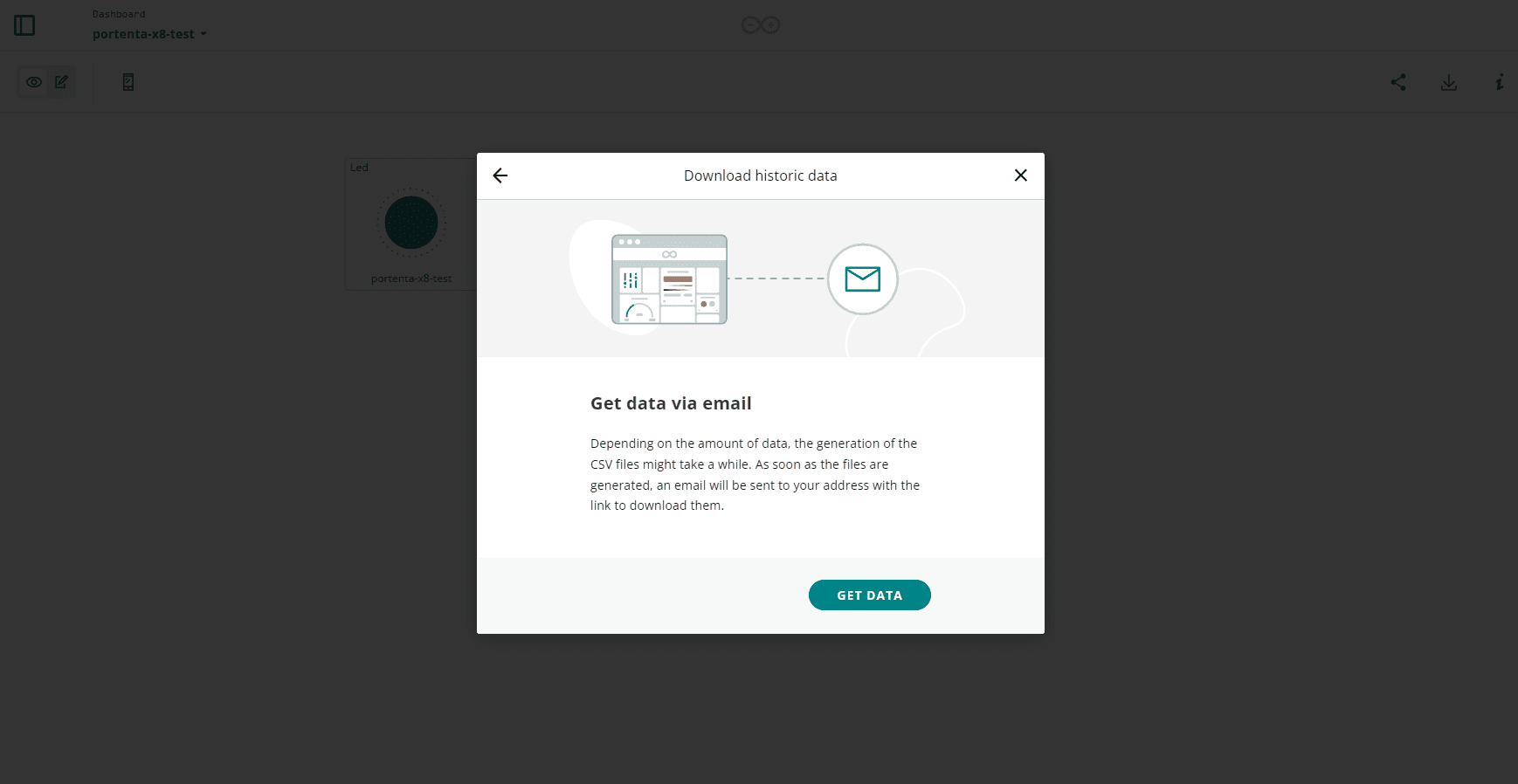 To start exporting your data locally, navigate into one of your dashboards on the Arduino Cloud. While inside a dashboard, press the Download icon in the upper right corner. This will open a new window that will allow you to select which historical data you would like to download.