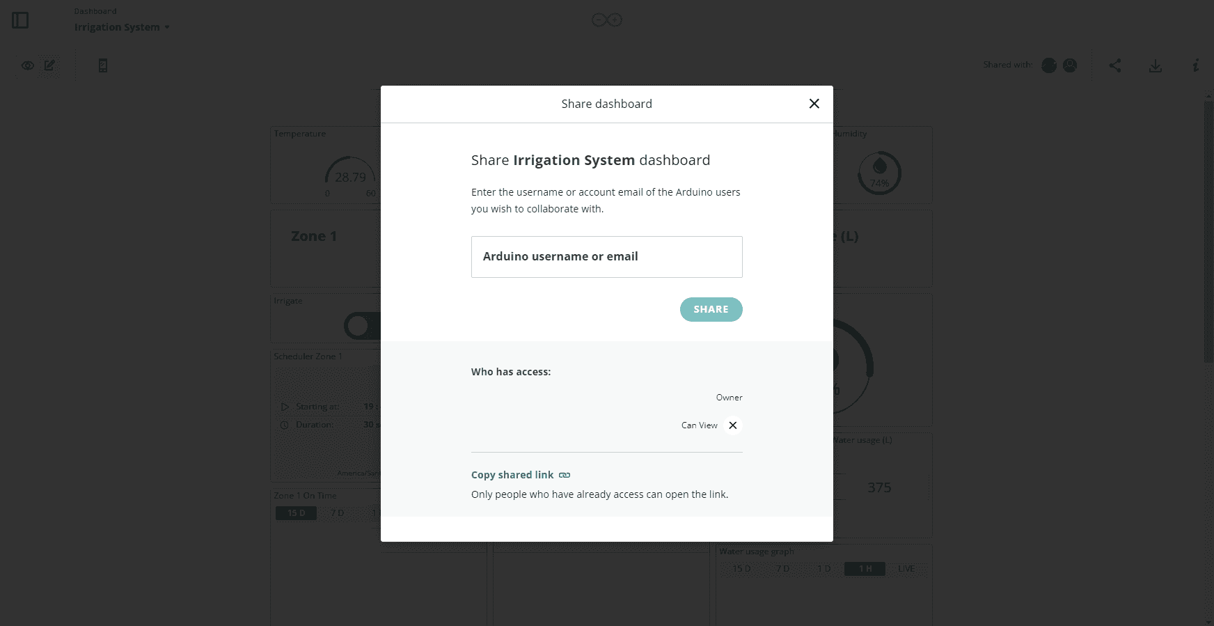 Whether it is your teammate, your customer, or your system integrator; you can freely share your dashboards with all the people you like. Just keep in mind that the interested stakeholders need to have an Arduino Account to access the dashboards.