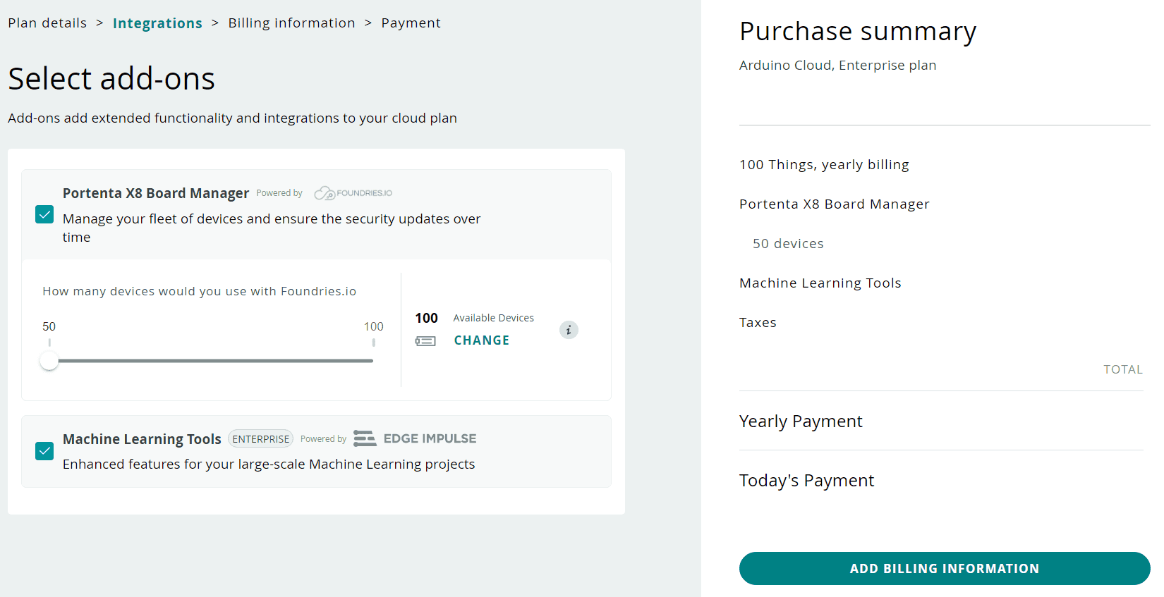 Proceed by marking the optional add-ons you may need in your projects and click on Add billing information. To learn more about these add-ons, check the dedicated section of the present getting started guide.