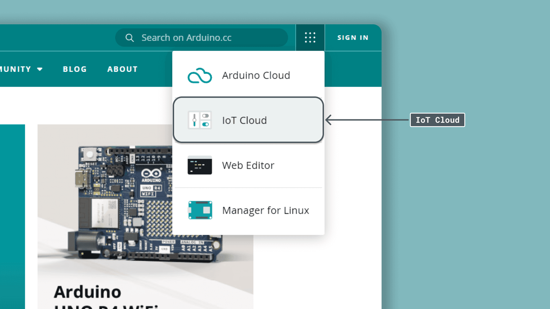 To start, we will need to head over to the Arduino Cloud. This is also accessible through the menu at the top right.