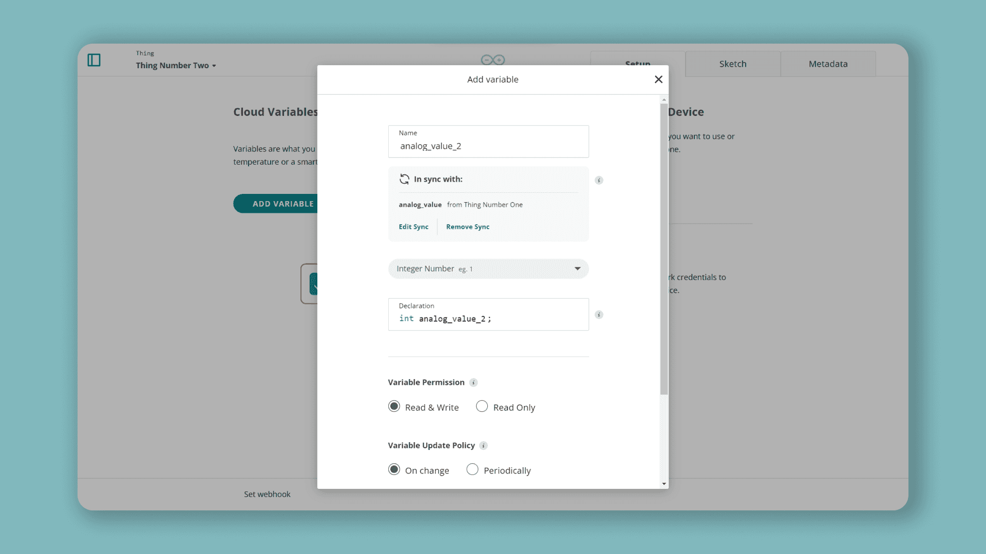 Next, we can repeat the same process for the boolean variable, but instead of selecting the analog_value variable to sync with, select the boolean_sync variable. Now we should have two variables that are synced with our other Thing.