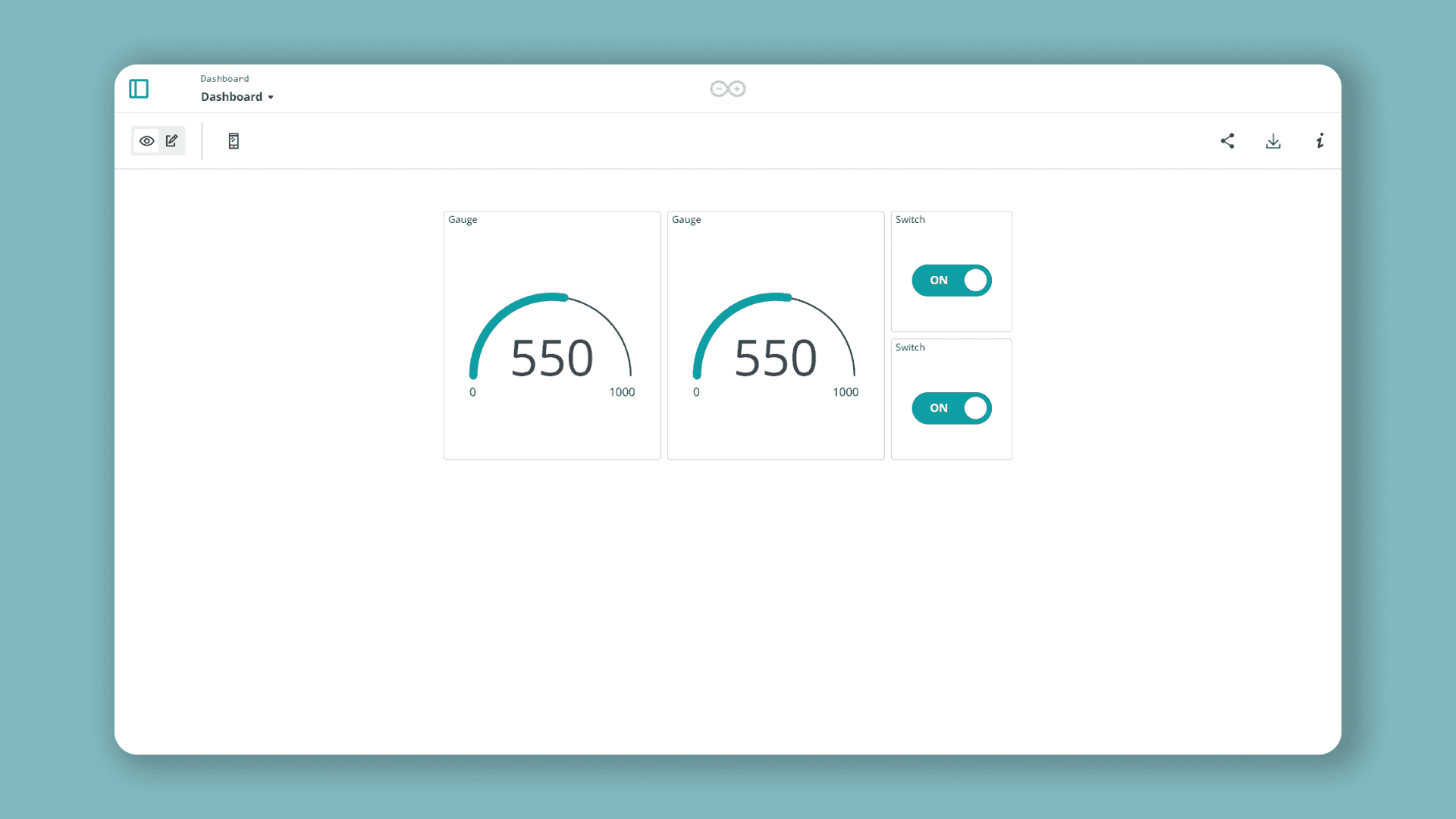Our widget will now appear in the dashboard. Next, let's add a Switch widget, following the same process to link it to the boolean_sync variable inside Thing Number One. After adding it, we will have two widgets: a gauge and a switch.