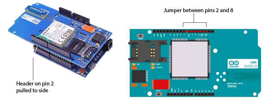 On the GSM shield, connect a jumper wire between digital pins 2 and 8. This routes the signal from pin 2 of the GSM shield to pin 8 of the Arduino.