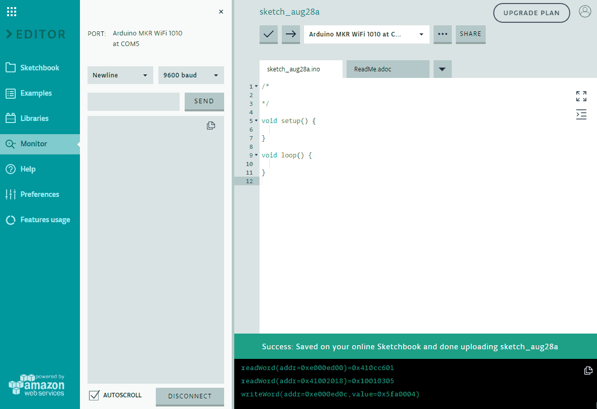 Before starting with programming, and after connecting your board to the computer, make sure you have selected the right board and communication port in the Tools menu of the offline IDE (or the drop-down list of the online one). You will not need to unplug the board in the process that follows.