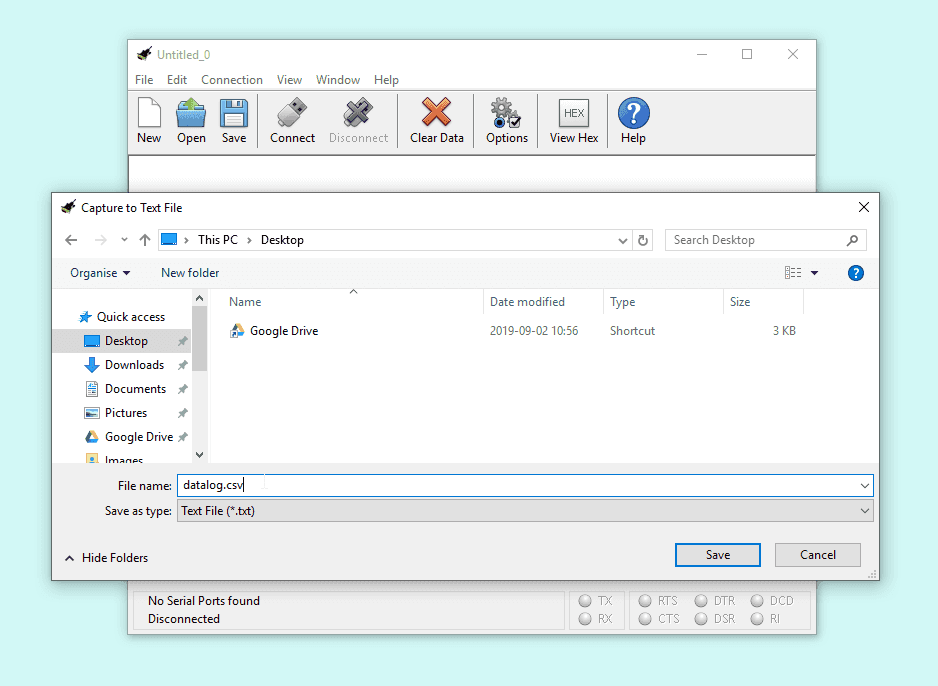 When calling the option of using a file in CoolTerm, it will give you the option of choosing where to record the file in your computer and how to name it. Just to make it easy, store the file on your desktop and name it datalog.csv