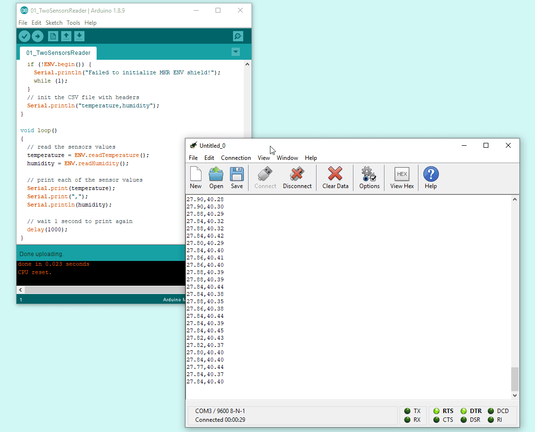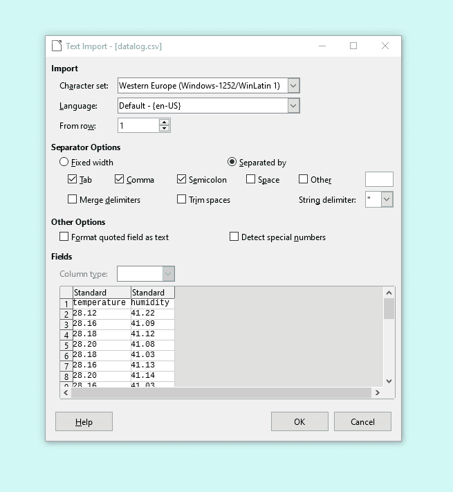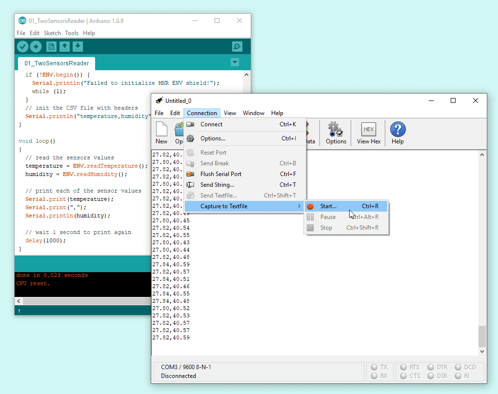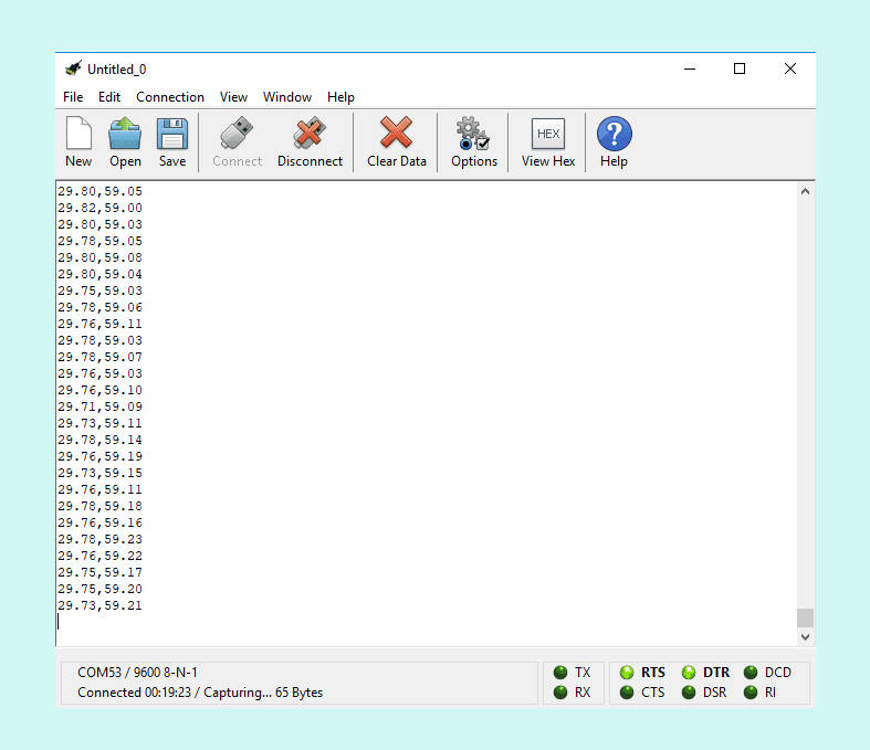 Click on the Connect button on CoolTerm’s interface, you will see how data is displayed while -in the background- it is being stored in the file you just created. Do not keep if for too long this time, we are recording data once every second, if you wait for a couple of minutes, you will have enough data to get some meaningful results. Since you are playing with temperature and humidity try to cover the sensor with your hand, blow air on it, place your board close to a cup with some hot liquid (not inside!!) … the data you will gather will be directly visible on the graph you will create later.
