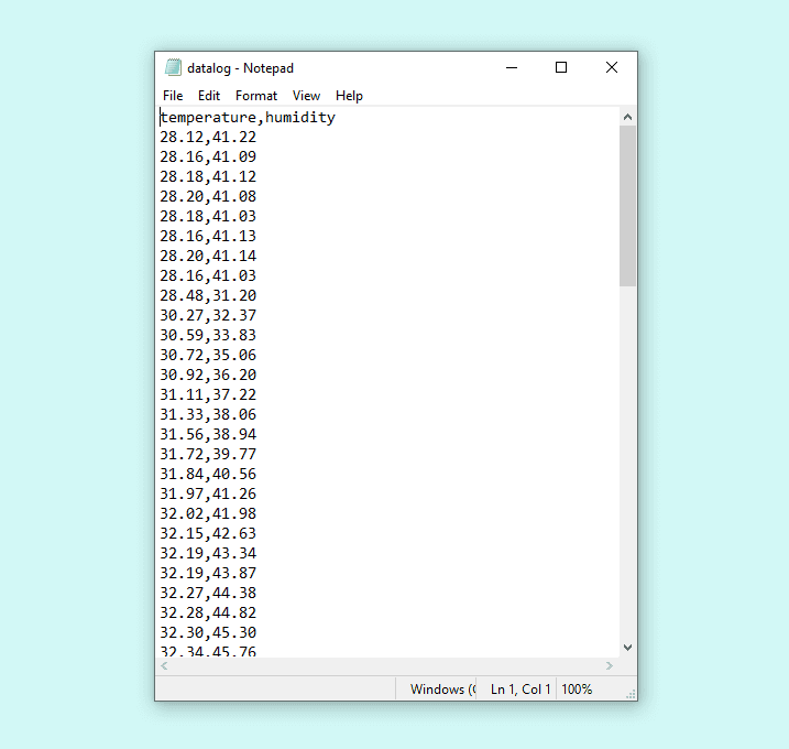 As you can see the file will be of a size of tens of kilobytes after recording data for 5 minutes. The bigger the file, the harder it will become to open it in a plain text editor. E.g. if your file is over 100KB, it is better not to look at it with this kind of software and instead directly import it in the spreadsheet program.