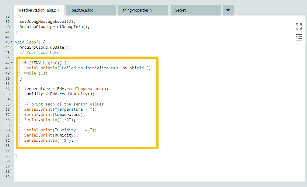 Finally, go into the loop part of the program, which just contains the update for the Arduino Cloud variable, and add code to check whether the shield is working, read the two sensors, and send them to the Serial port. Note how the variables temperature and humidity are pre-defined in the “thingProperties.h” tab.