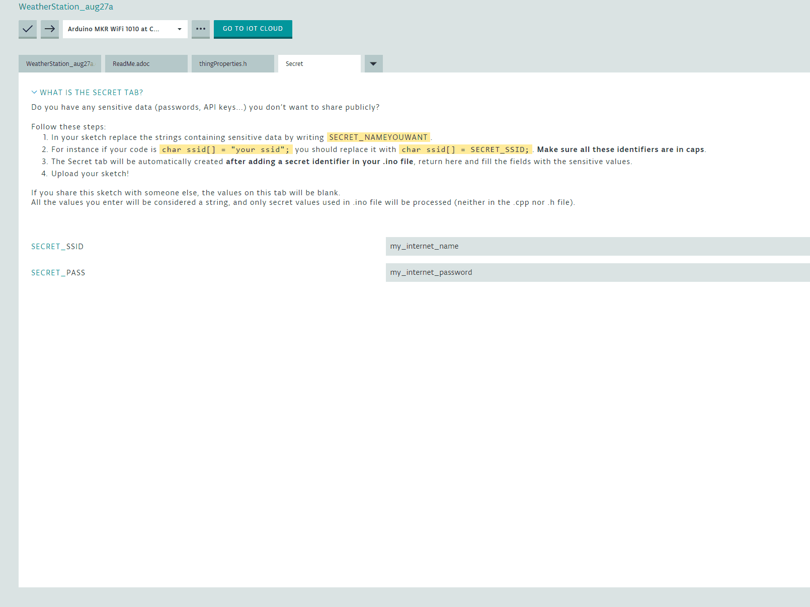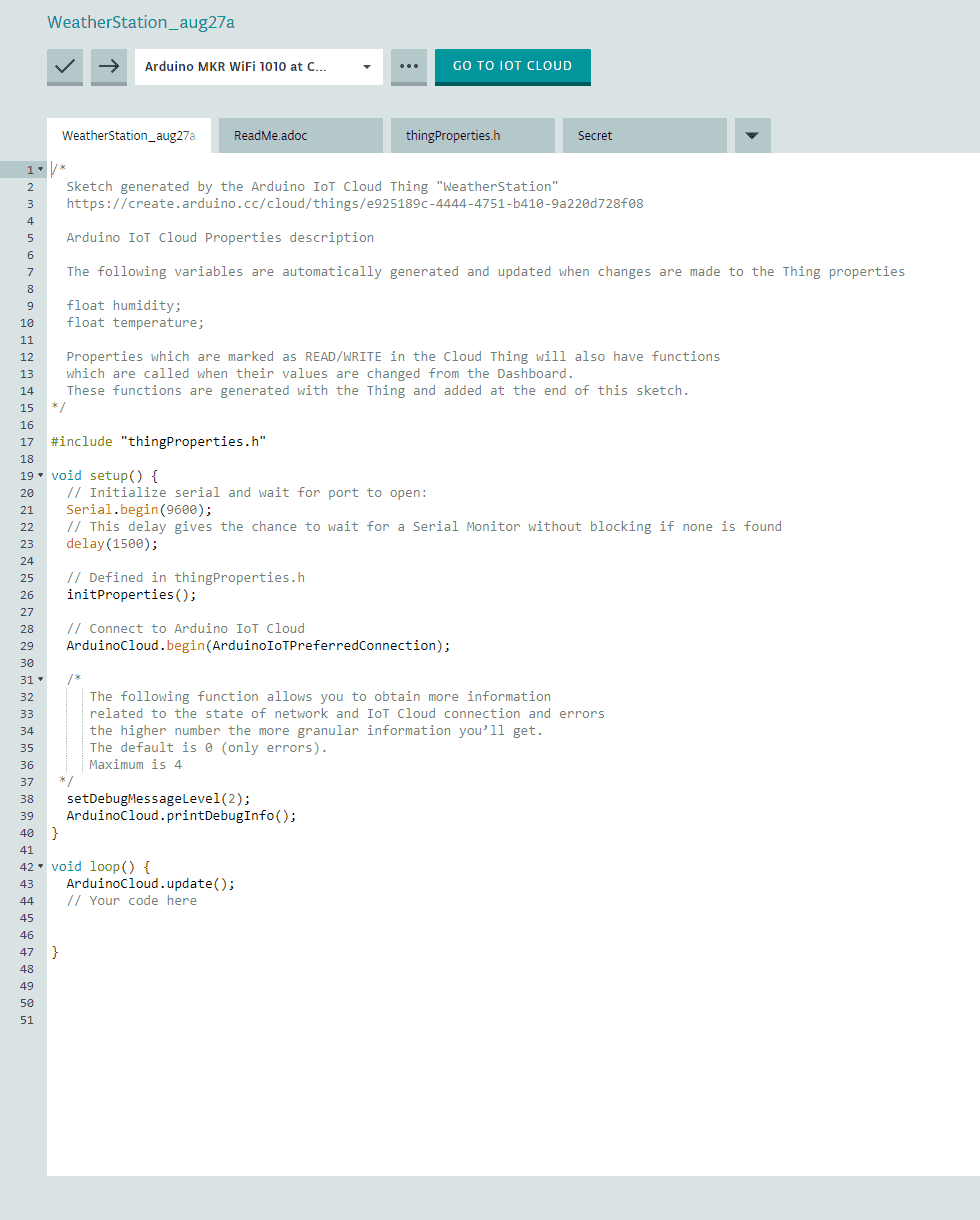 On the other hand, be aware that there is data in the “thingProperties.h” that you should not touch as it is generated by the platform. Each time you add a new Thing, it will get a specific number that will associate the device to the Cloud. In particular, the ThingID is a unique number that should be used only for that one device you created throughout the Wizard. That number, in combination with the crypto chip on your board create a unique way of identifying the board against the platform, what makes the communication safe, both for you and for our infrastructure.