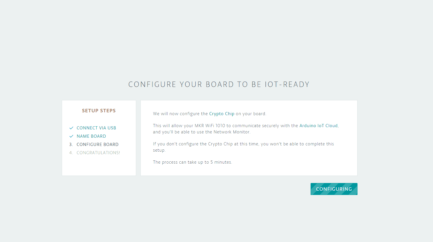 After naming your board, you will be given the option to configure the board’s crypto chip. This is a process you have to go through. The crypto chip on the MKR boards allow for unique identification of the boards against the Arduino infrastructure. This process will take a couple of minutes. Once it is done, the interface will give you the option to return to the IoT configuration.