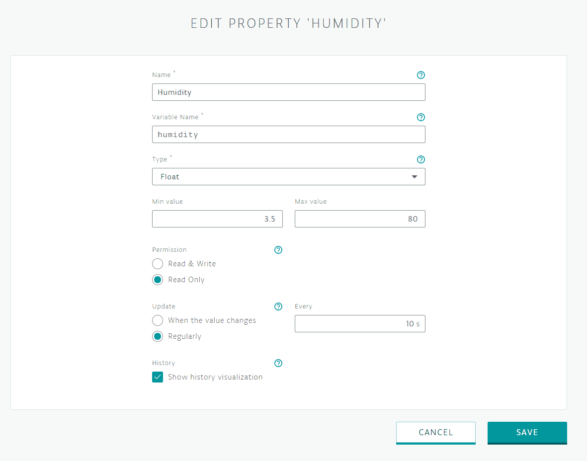Once you have registered the Thing, the interface will offer you the possibility of adding properties to it. Properties represent variables in Arduino code that will also readable in the Cloud. We will map two variables / properties: temperature and humidity. You will have to run the process twice. The definition of these properties includes determining:
