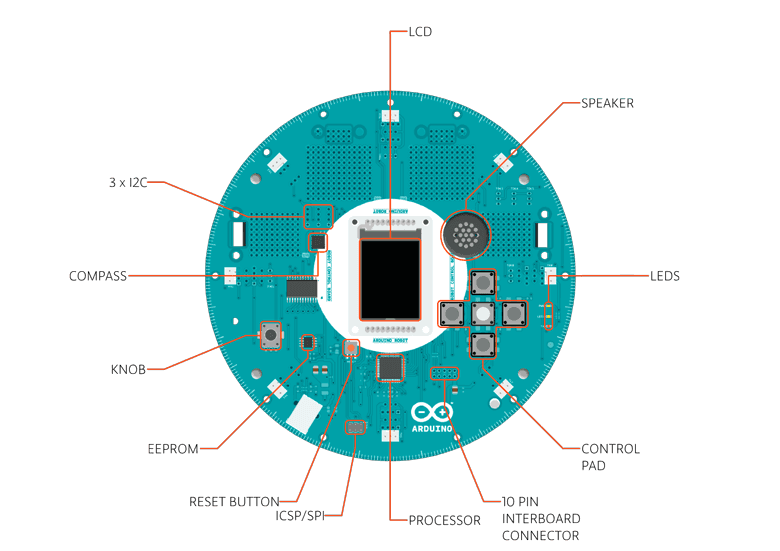 The robot comes with a large number of inputs; two potentiometers, five buttons, a digital compass, five floor sensors, and an SD card reader. It also has a speaker, two motors, and a color screen as outputs. You can control all these sensors and actuators through the Robot library.