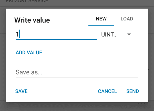 Tap the arrow pointing up to open the Write value popup, then set the data type to UINT 8 and tap on the line to write your chosen value (either "0" or "1"). As soon as you tap on send the value is sent to the 101 board and the LED instantly changes accordingly.