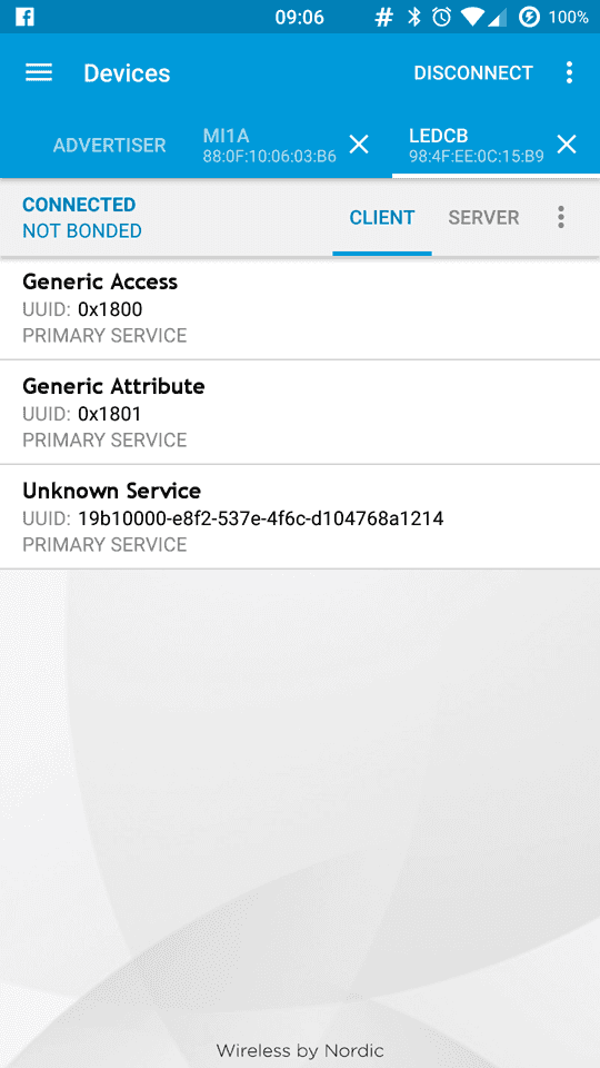 Tap on connect to open the following screen, where you find the description of our Bluetooth® Low Energy service offered by the 101 board. The unknown service has a UUID 19B10000-E8F2-537E-4F6C-D104768A1214 and it is set by the