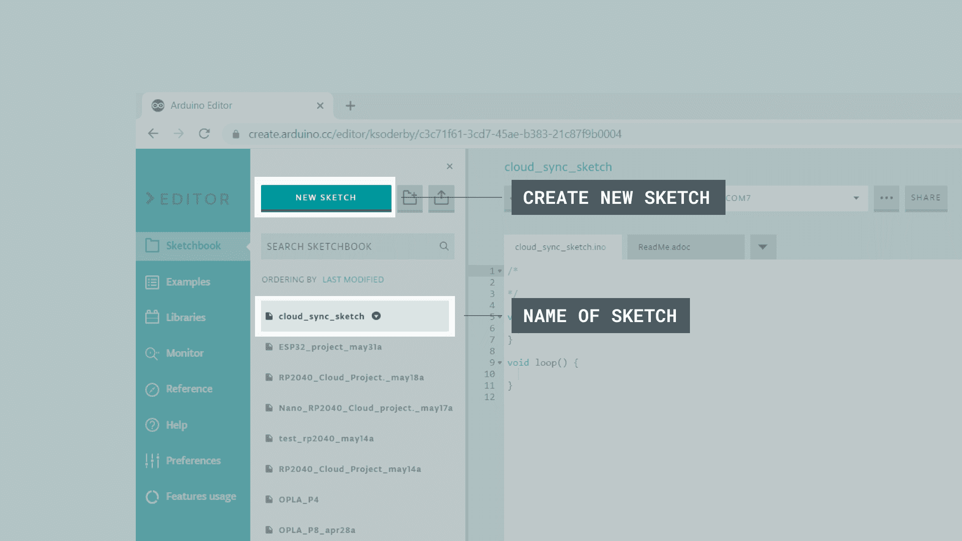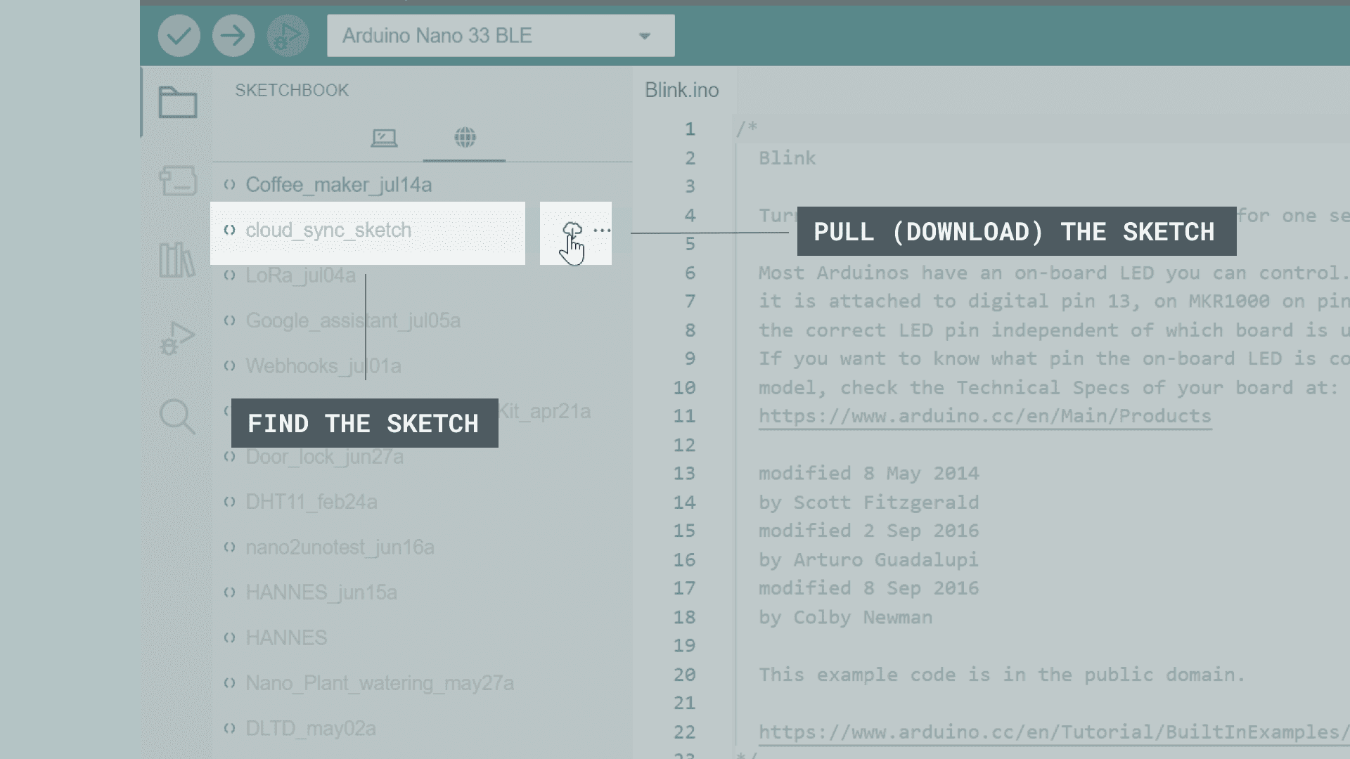 Backup your code: Your sketches are too important to risk losing them! And life is too short to make copies manually. With Remote Sketches you only need one click and they will be saved in the Arduino secure Cloud.