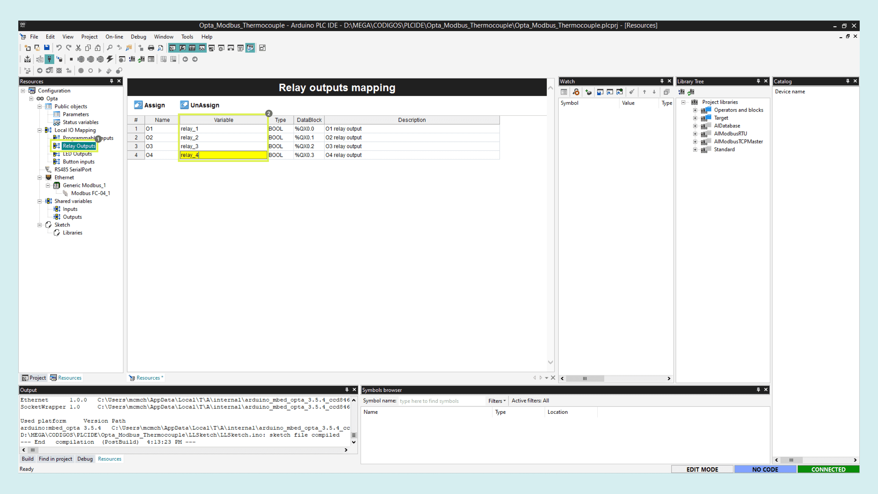 Finally, define the Opta™ outputs behavior in function of the temperature read from the Portenta Machine Control. To do this, go to the resources tab > Relay Outputs and give a variable name to each relay, in this case, call them