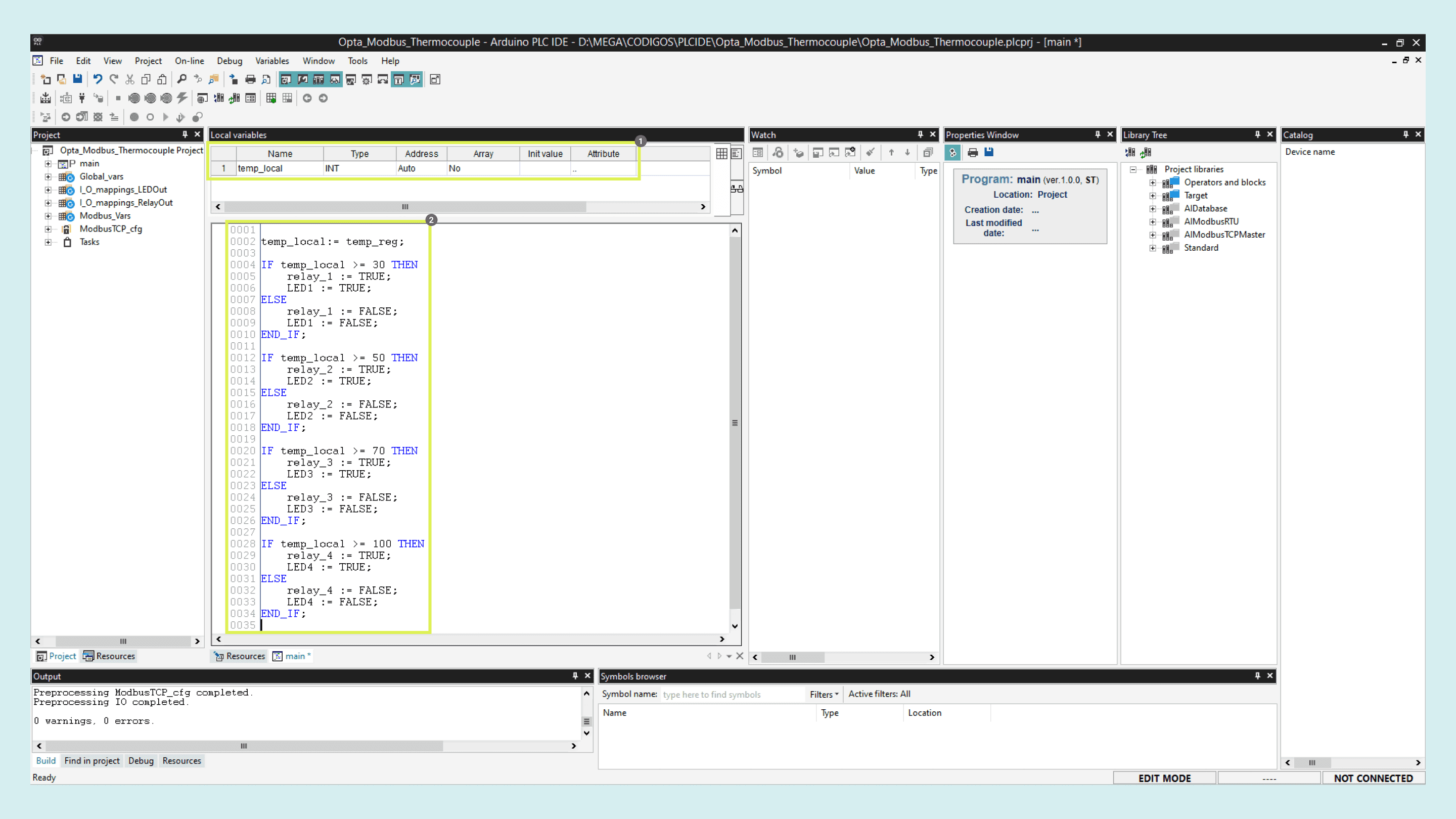 Now go to the main code in the Project tab. Create a variable by right-clicking on the local variables window and then insert, call it temp_local and integer as the type.