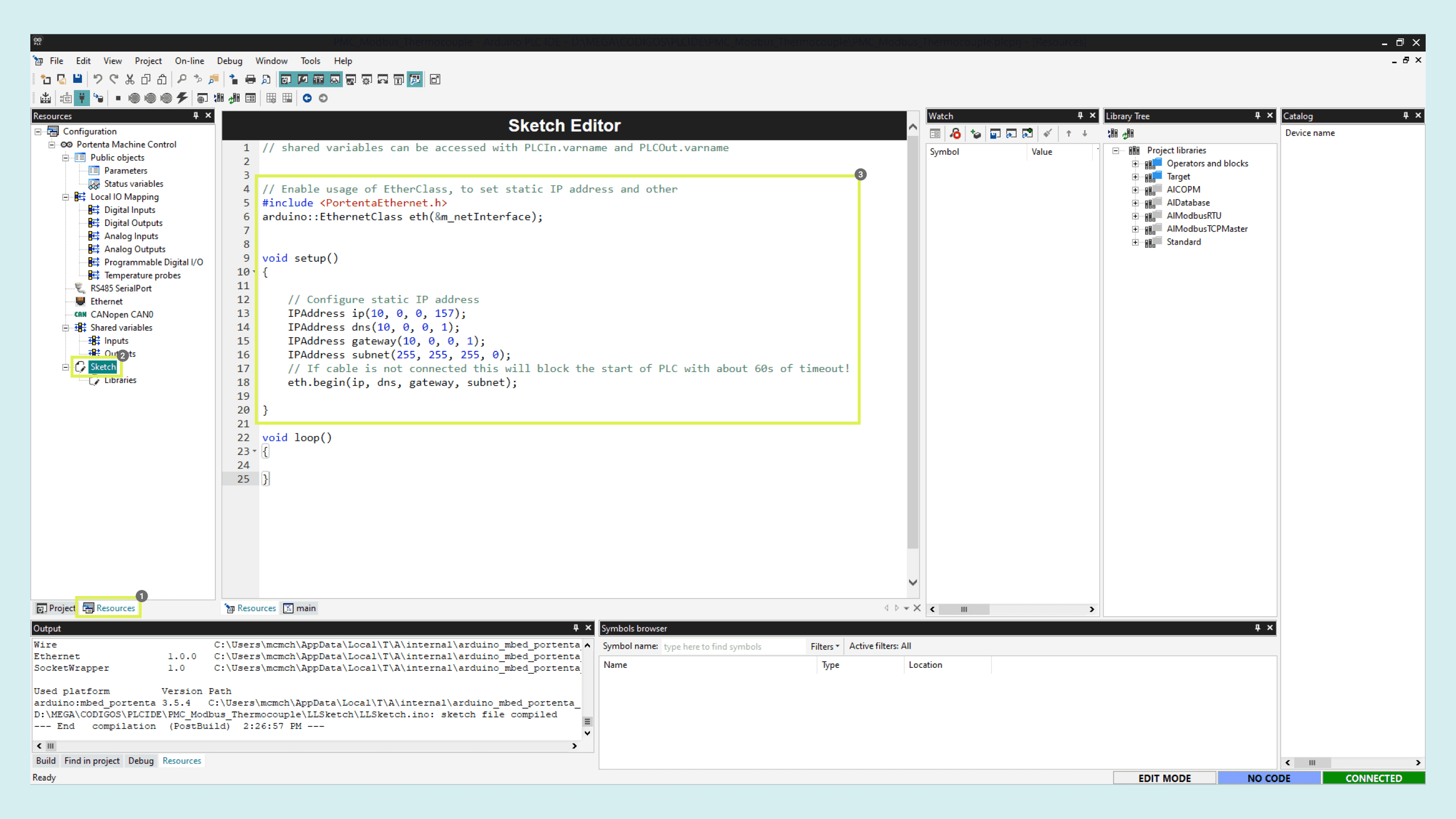 Go to the sketch editor and uncomment the library and setup function code lines. As the IP, we must use the same as the Portenta Machine Control, as it is connected to your local network, you can find it on its configurations.