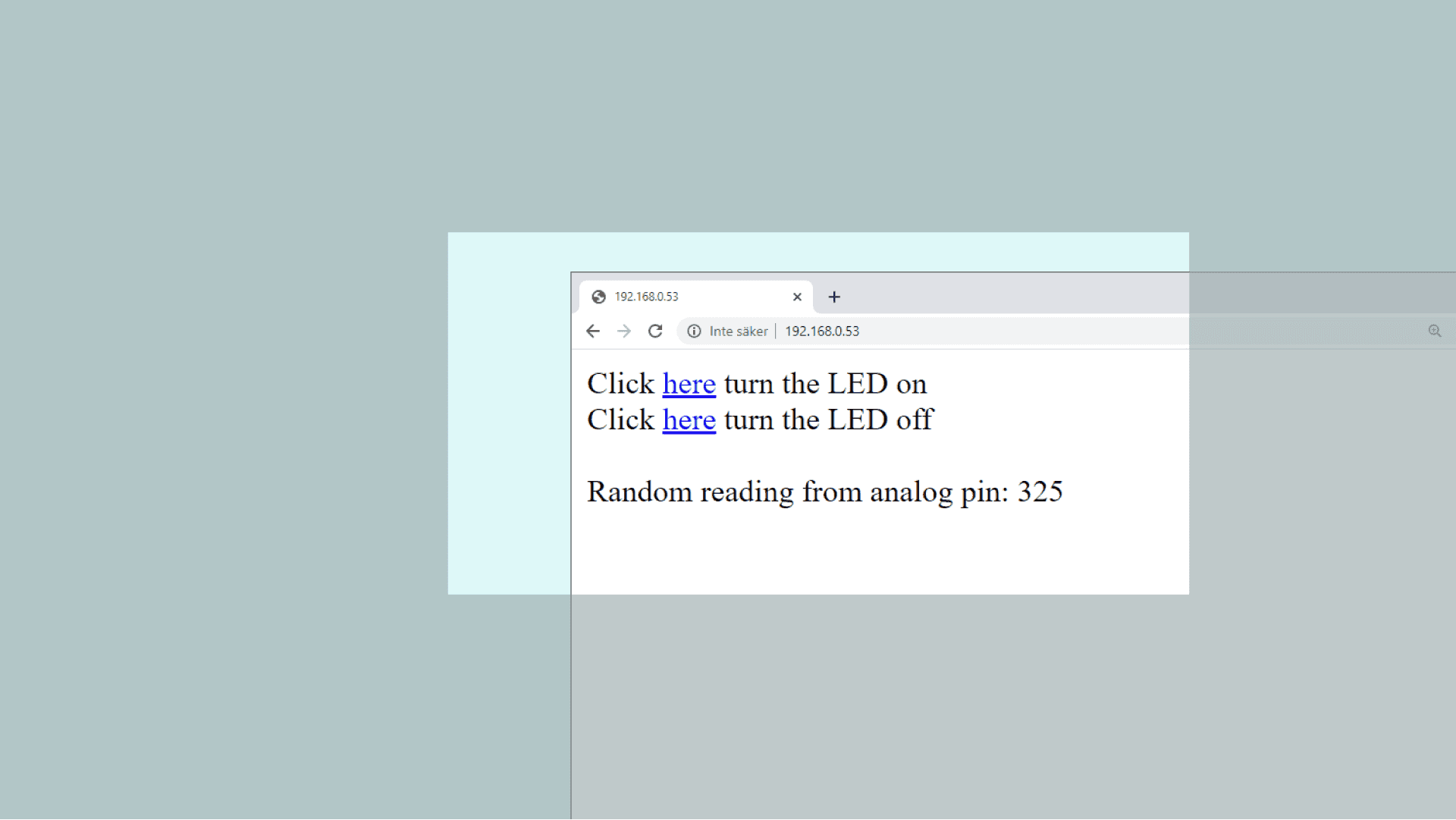 Copy the IP address and enter it in a browser. Now, we should see a very empty page with two links at the top left that says "Click here to turn the LED on" and "Click here to turn the LED off".