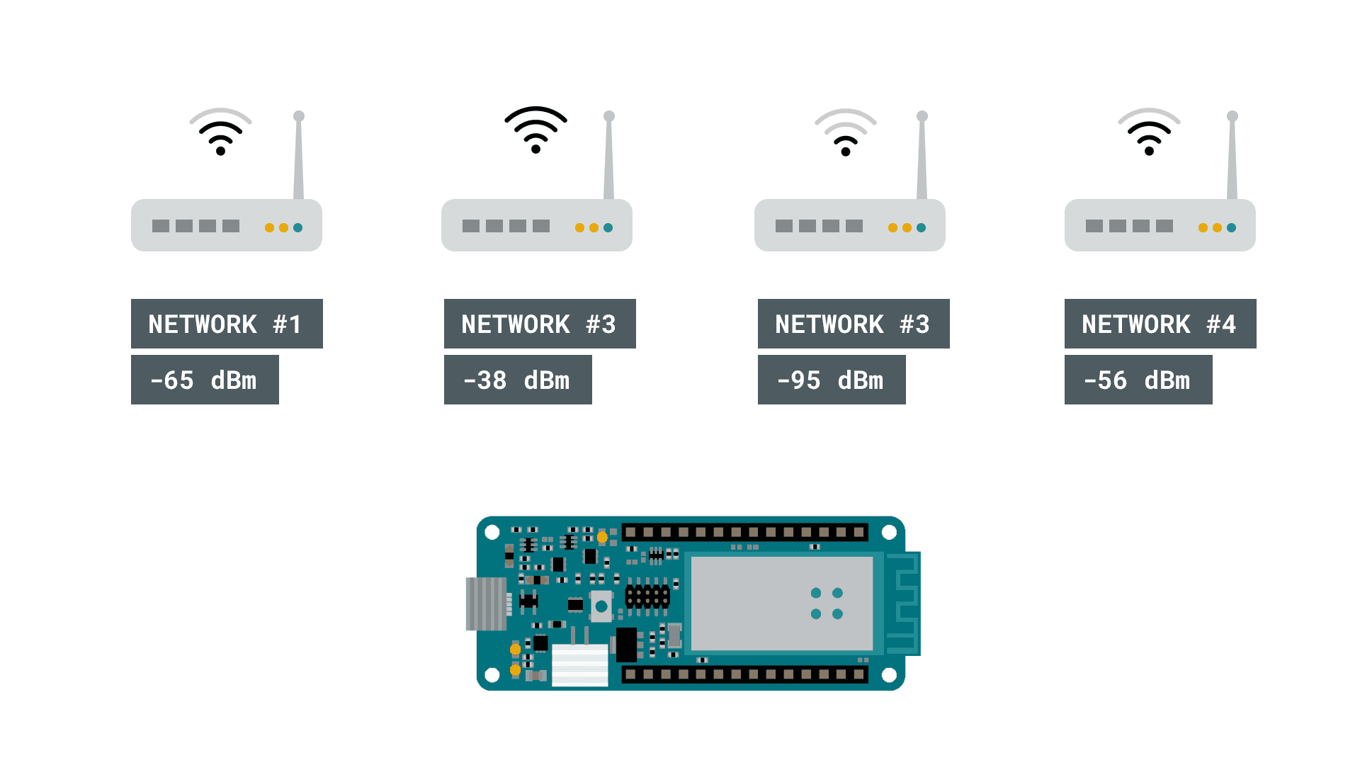 Scanning for Wi-Fi networks is a quite straightforward process. A device with a Wi-Fi module such as smart-phones, computers or development boards such as the MKR 1000 WiFi, search their surroundings, and get a response from nearby networks.