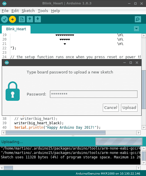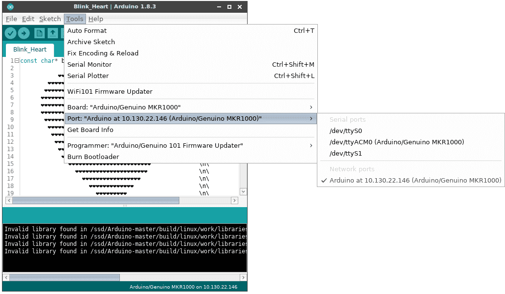 We are now ready to upload our new sketch wirelessly! Select the correct Network port in the Ports menu and press "Upload"