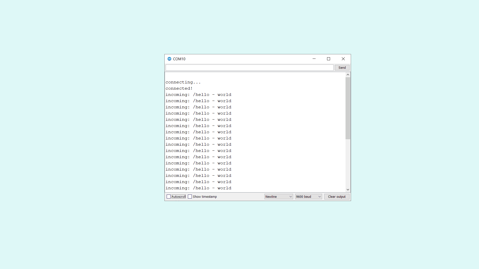 73 // publish a message roughly every second.74 if (millis() - lastMillis > 1000) {75 lastMillis = millis();76 client.publish("/hello", "world");77 }78}