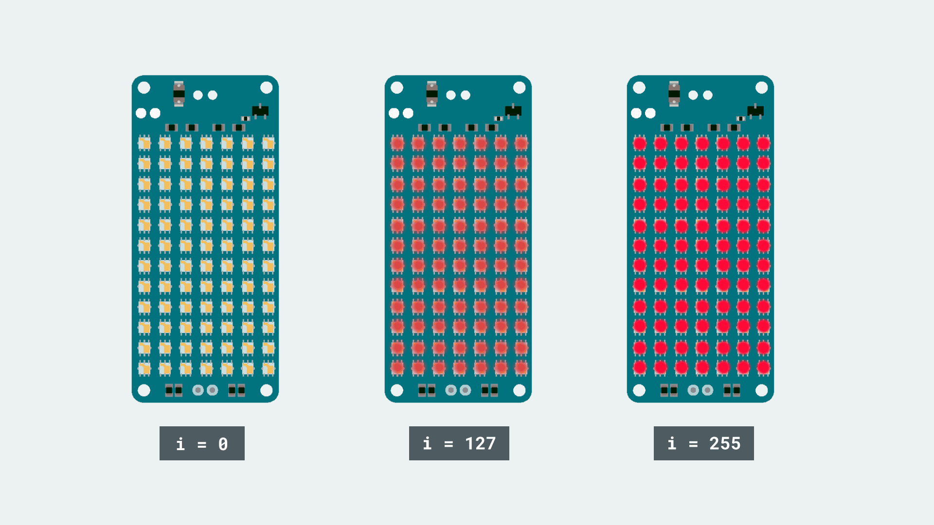 loops are a great method to use when we want something to run for an X amount of times. It is widely used for fading lamps, gradually increase or decrease the speed of motors, or for any other counting mechanisms. Its operation is pretty basic and in this case, only uses one variable, so let's take a look at how it works in action!1for (int i = 0; i <= 255; i++){2 // do something 255 times3 delay(10); //quick pause between the loops4}