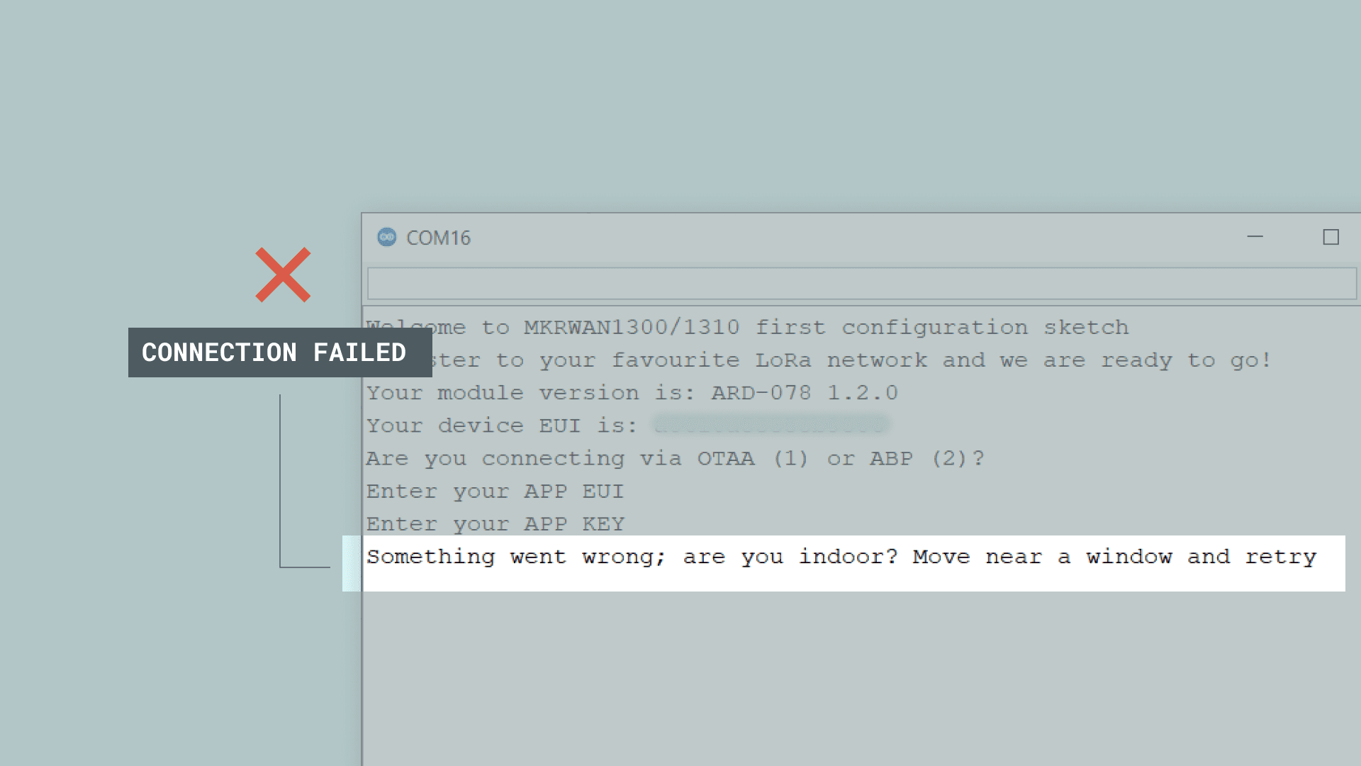 Now it will proceed to ask for our APP EUI and APP KEY. Simply copy these from the device information inside the TTN service. Once we have entered them, the device will try to connect to TTN.
