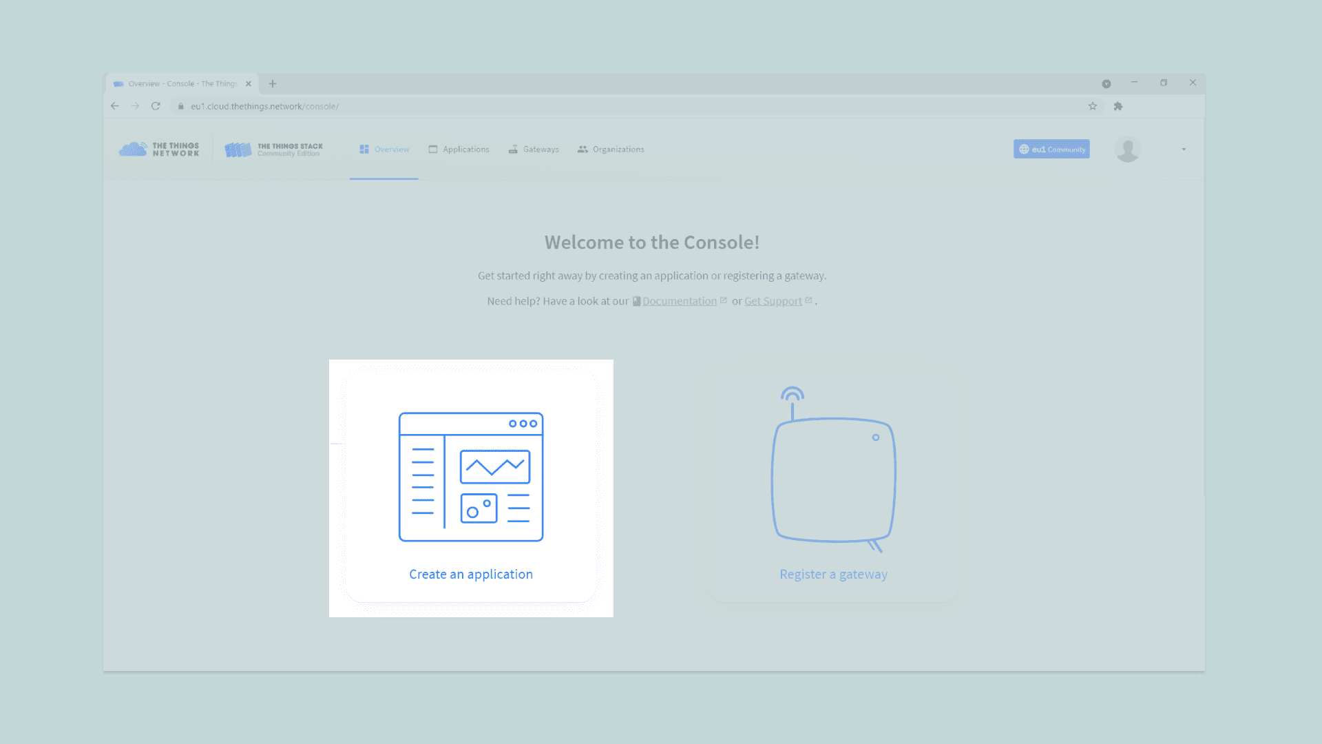 Once we have activated our account, go to the TTN landing page, first select your region and log in, then you will be taken to the landing page. Here, we will click the "Create an application" button, or "Go to applications" if you already have one created.