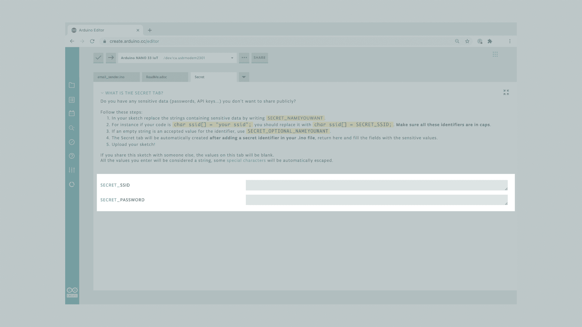 Let's start by creating a secret header file to store our credential for the Wi-Fi network which we will connect to. In this way we don't accidentally store our credentials in a code we may share on the internet. To do this, we need to click the downward arrow next to our sketch tab, and click Add Secret Tab. This will create a tab called Secret.