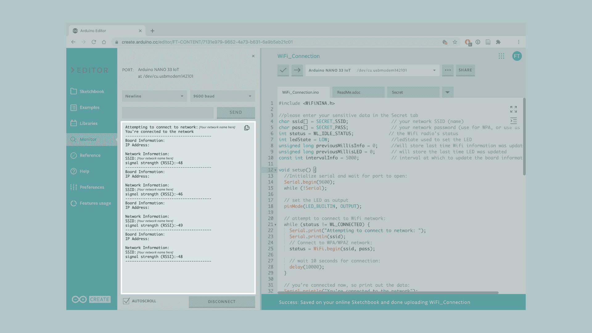 After you have successfully verified and uploaded the sketch to the board, it's time to put it to the test. Don't forget to enter the credentials of the network in the Secret tab. Once the board it's connected to the network we can see the information in the Serial Monitor.