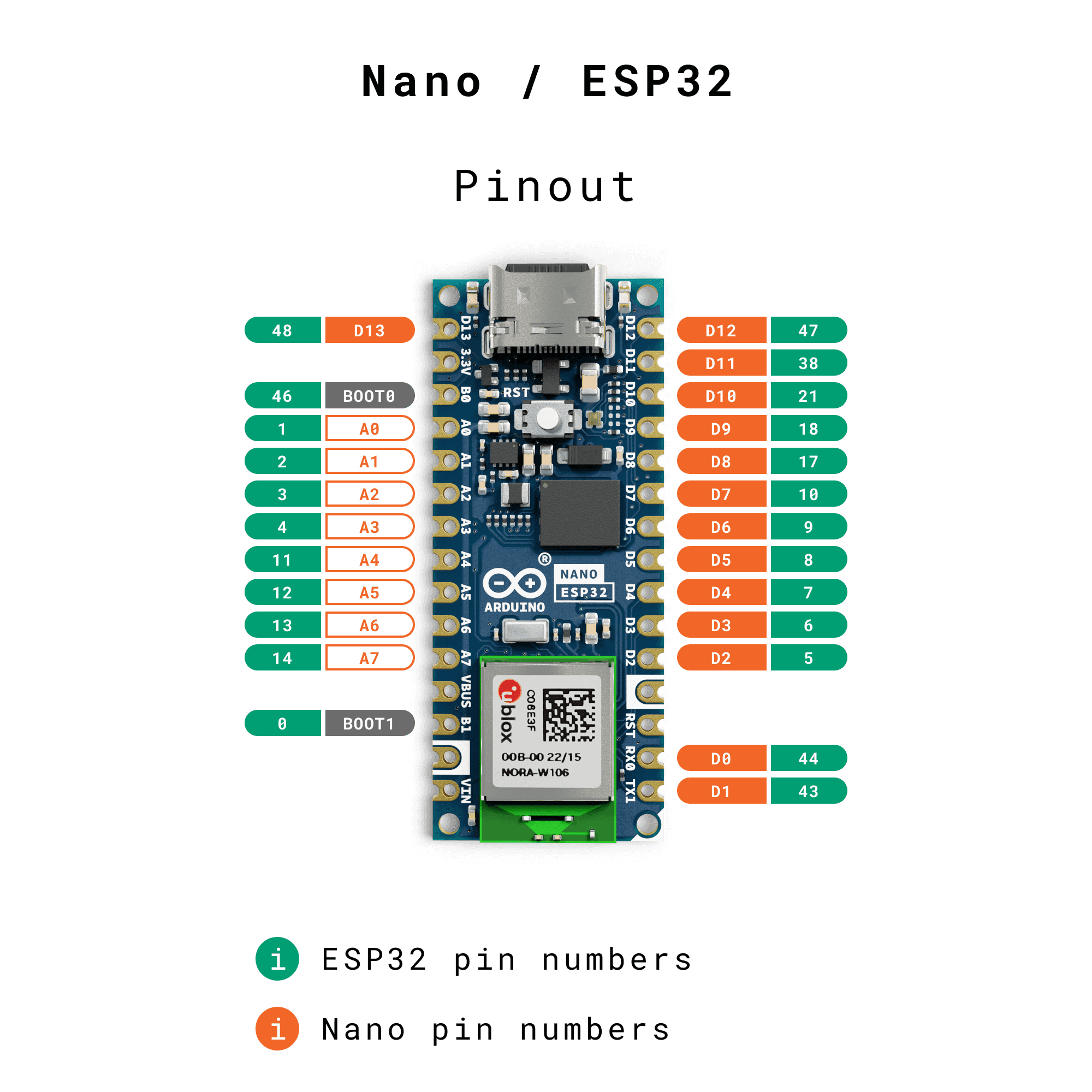 The Arduino Nano ESP32 is a Nano form factor board based on an ESP32-S3 SoC. This board is part of the Arduino Nano Family, and follows the same pinout as all Nano boards. This is very convenient if you want to port a project from another Nano board, as you can preserve the same wiring and pin numbers in the code.