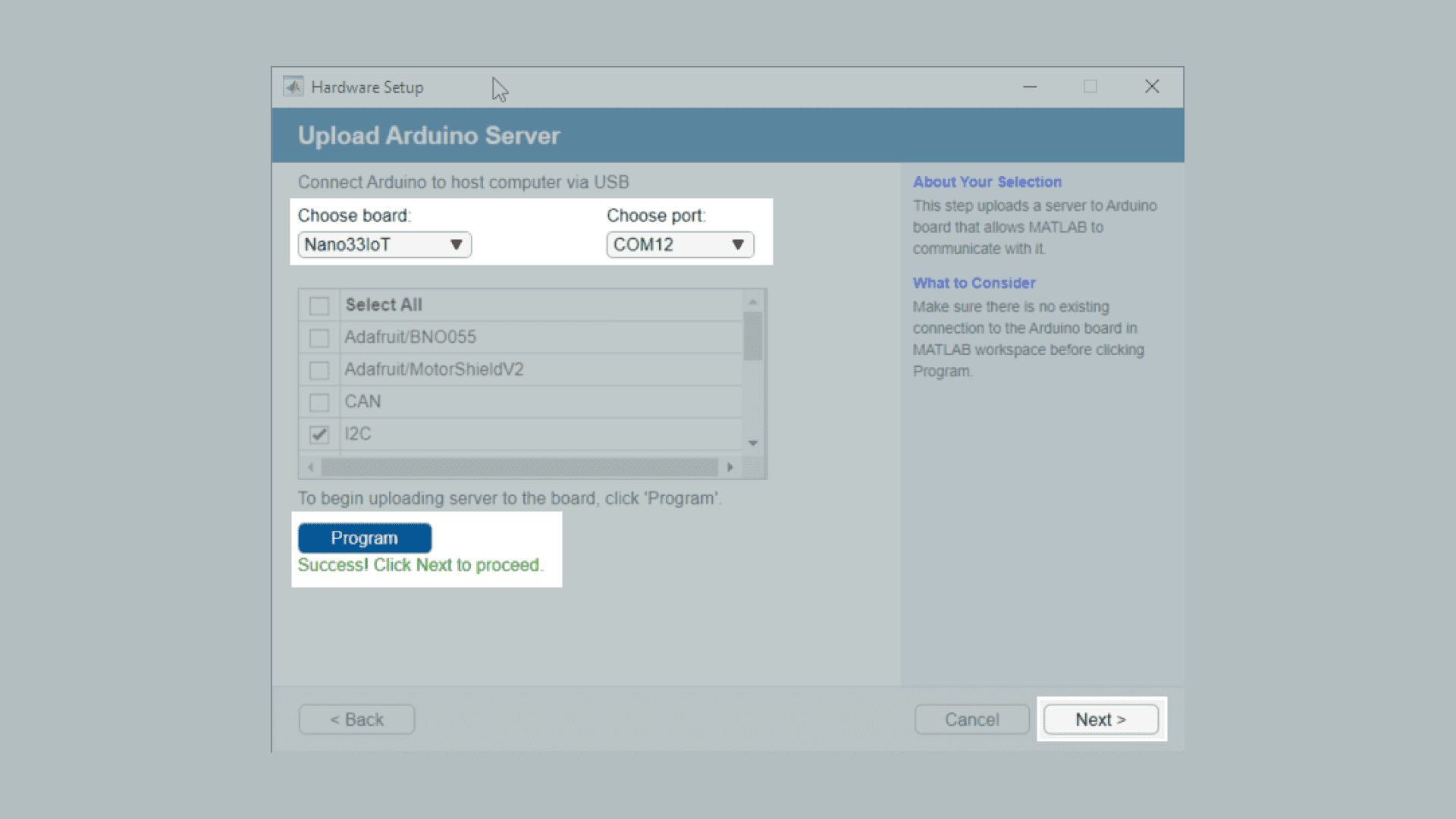 You can now control your Arduino Nano 33 IoT via MATLAB by a wired or wireless connection to control your devices and make use of the powerful features for scientific computing and developing engineering applications!