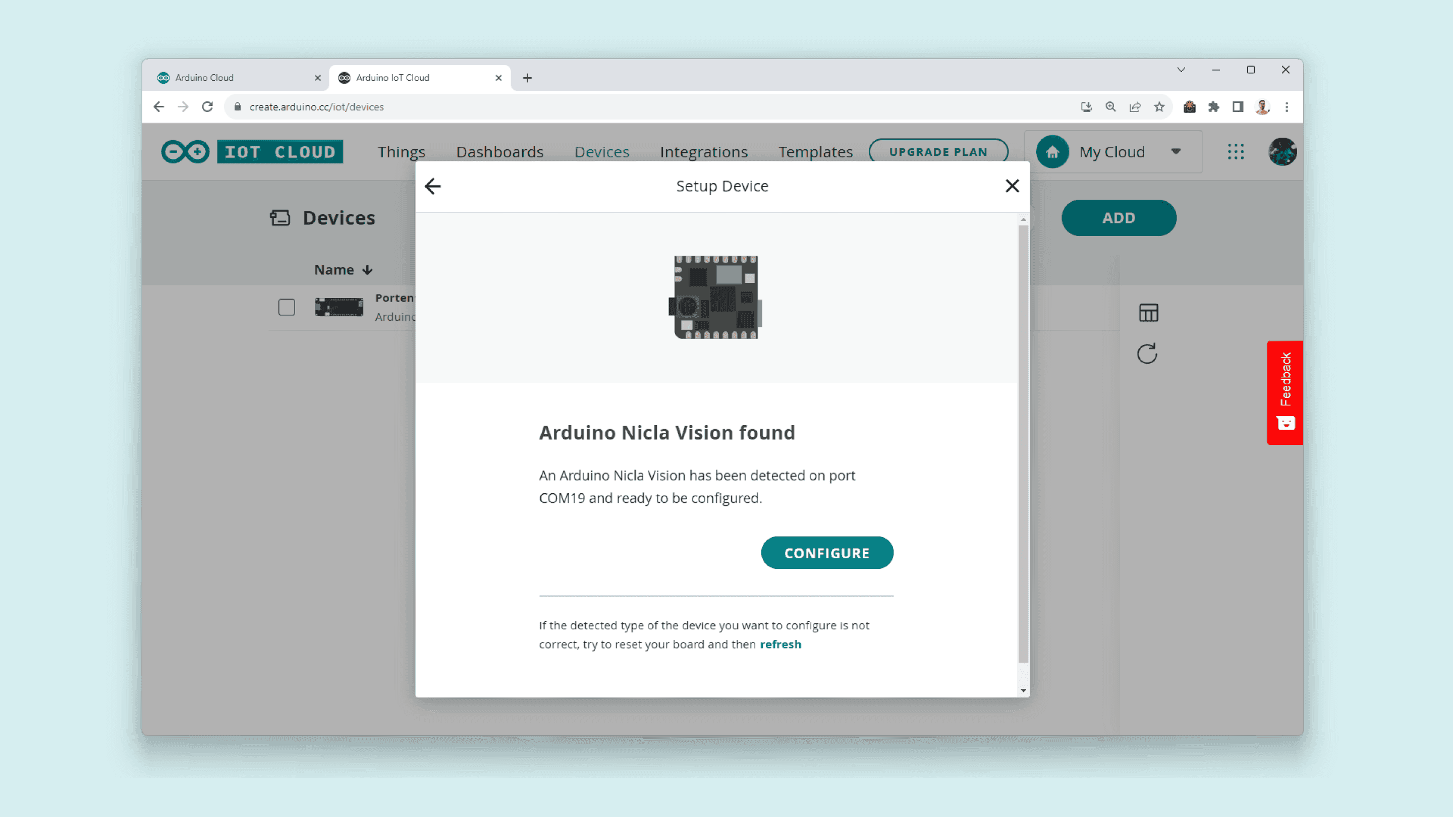 Click the CONFIGURE button, give your device a name, and your Nicla Vision will be configured to communicate securely with the Arduino Cloud; this process can take a while.