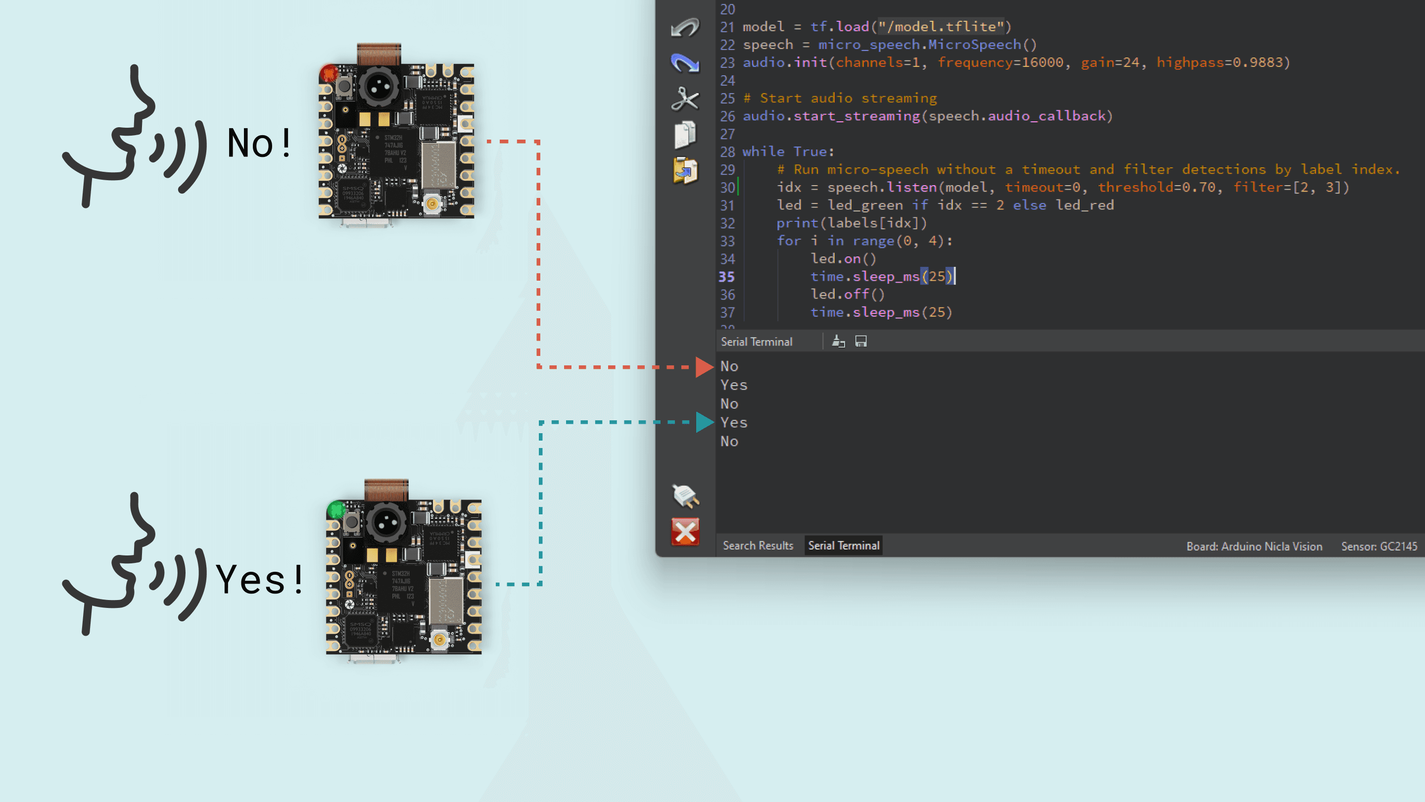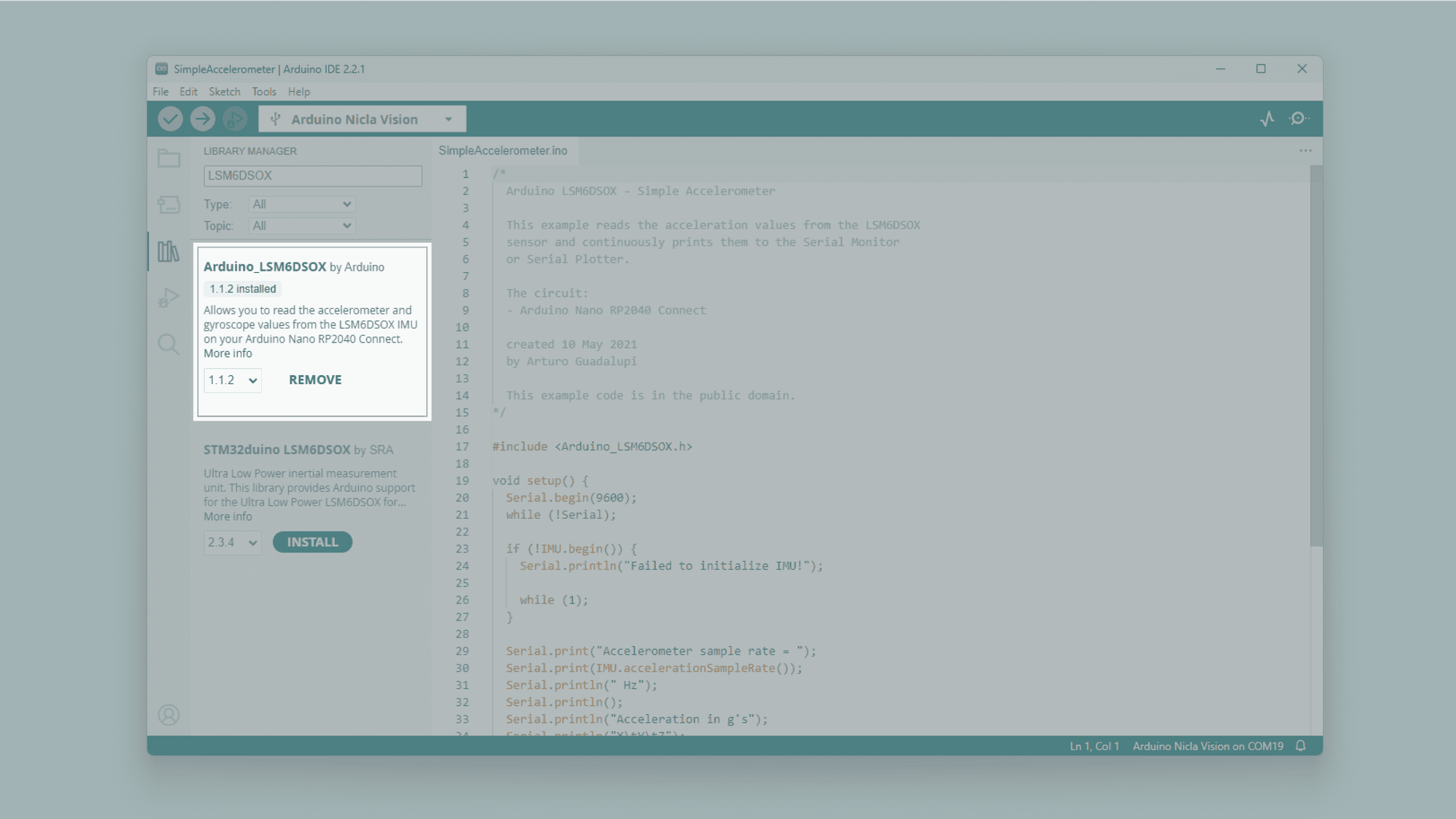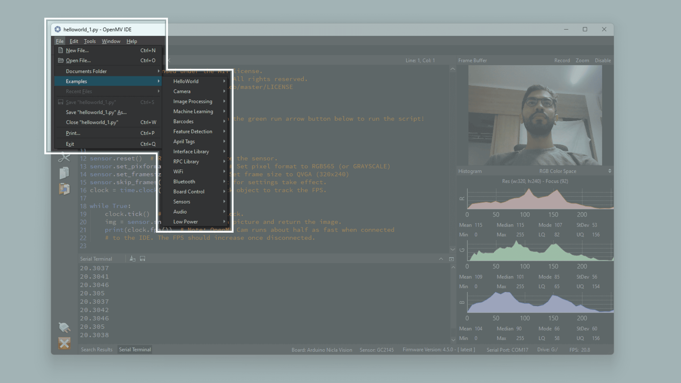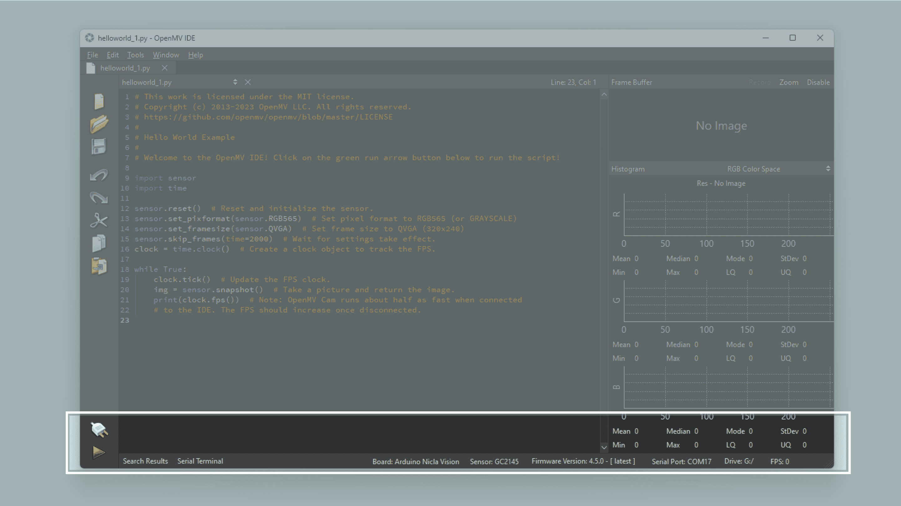 sketch. We will use this example to verify the board's connection to the IDEs and that the Nicla Vision core and the board itself are working as expected. With OpenMV