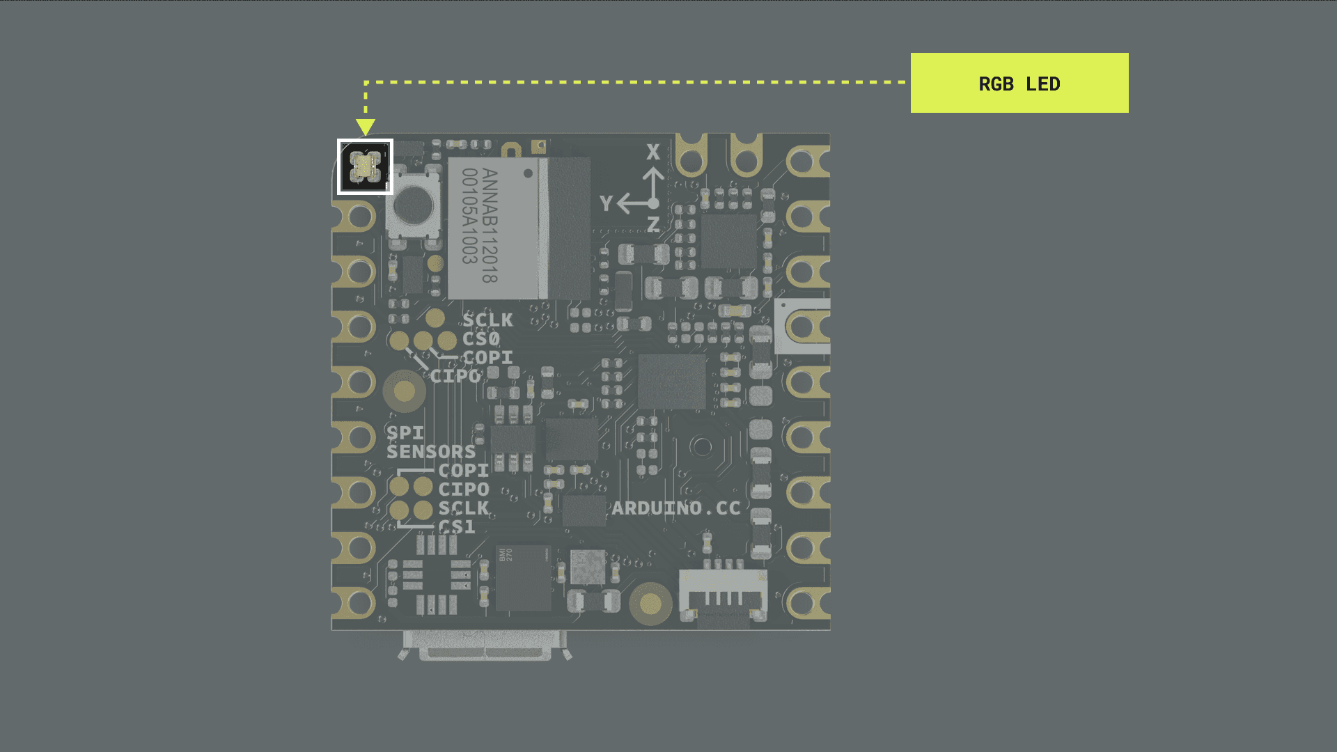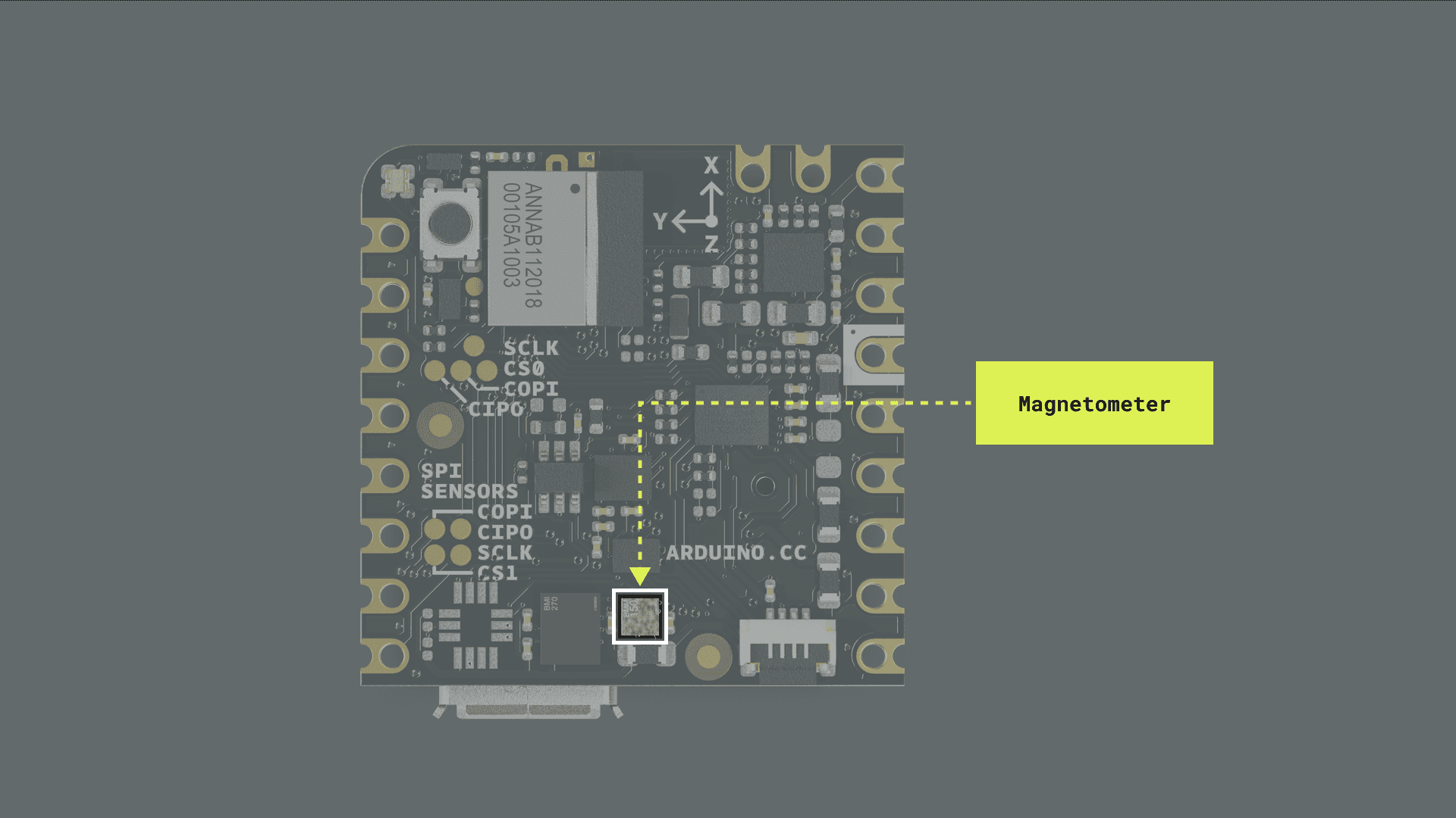 • Onboard advanced motion sensors: the board features the BMI270, a high-precision Inertial Measurement Unit (IMU) from Bosch® Sensortec, which combines a 3-axis accelerometer and a 3-axis gyroscope for precise motion tracking and orientation detection. The board also features the BMM150, a compact geomagnetic sensor from Bosch® Sensortec with a 3-axis magnetometer.