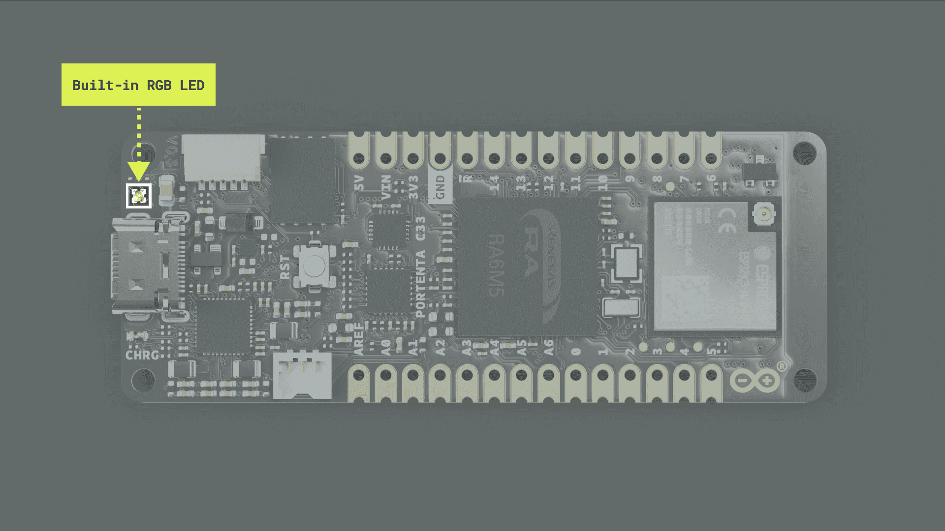 The built-in RGB LED on the Portenta C33 needs to be pulled to ground to make them light up. This means that a voltage level of