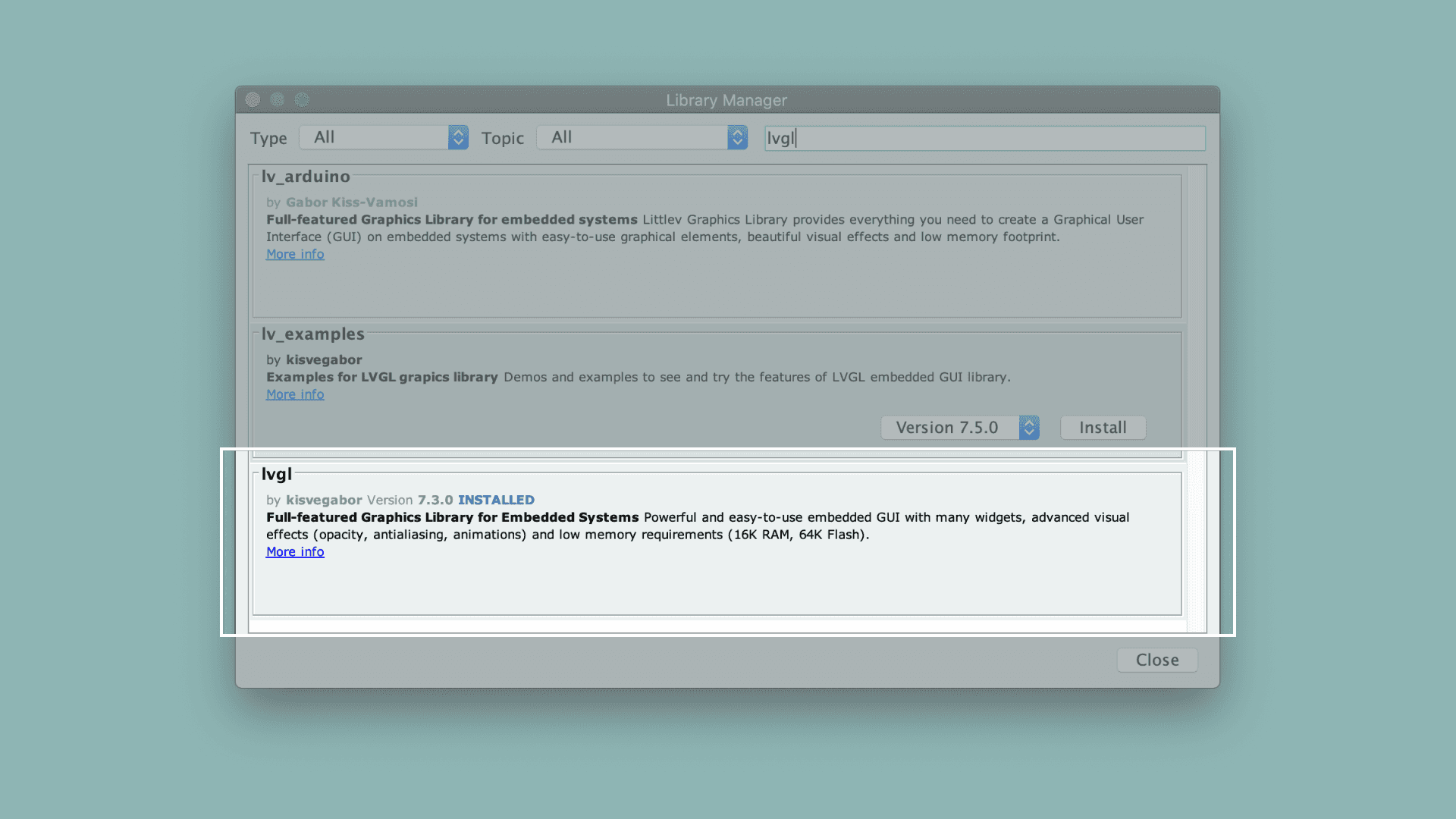 Next, select 'Portenta' in the Tools > Board menu before installing lvgl from the Library Manager. Then go to Sketch > Include Libraries > Manage Libraries and search for LVGL. Download lvgl by kisvegabor.