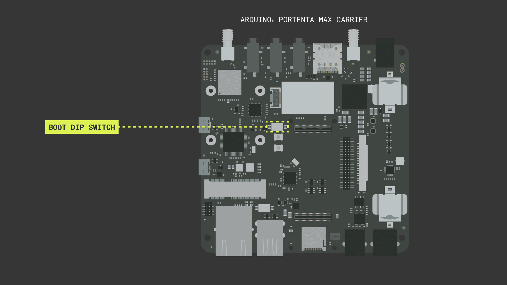 - Check the position of the BOOT DIP switch of the Portenta Max Carrier. If the Portenta H7 gets into bootloader mode immediately after power-on, including when connected via USB-C®, change the position of the BOOT DIP switch to OFF.