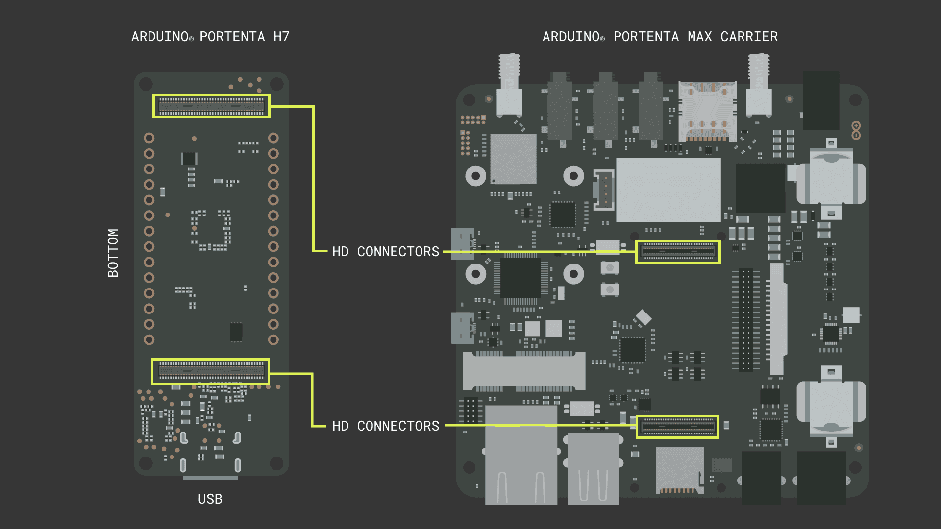 Begin by attaching the Arduino® Portenta H7 board to the high-density connectors of the Portenta Max Carrier, as shown in the image below: