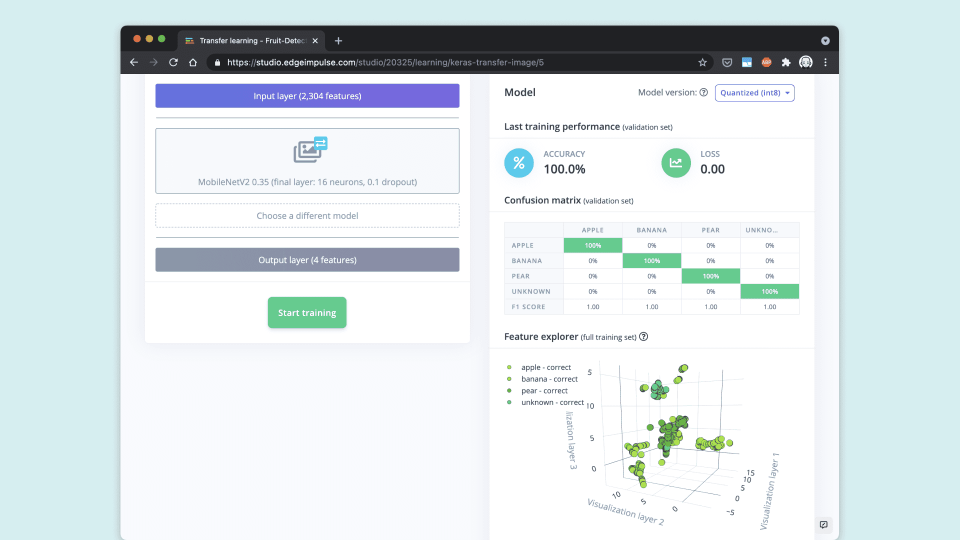 Click on "Start Training" to train the machine learning model. A small amount of images, the validation set, are put aside before the training starts to validate the trained model. Do not be confused with the test set which can be used to evaluate the final model. Once the training finishes, you will see some statistics on how well the model performed during validation. Ideally you get an accuracy of 100% for each object. If you get poor results, you may have some images which are not representative of the objects you are trying to classify and should be removed from the data set.