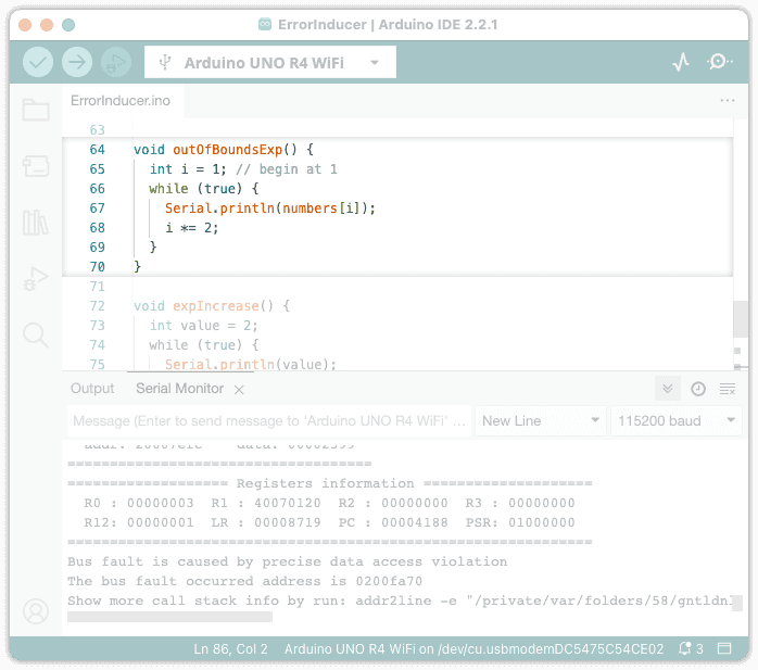 indicates that the error occurred on line 67. By reading further down the output, you can step backward through the function calls that were made./Users/username/Documents/Arduino/ErrorInducer/ErrorInducer.ino:67
